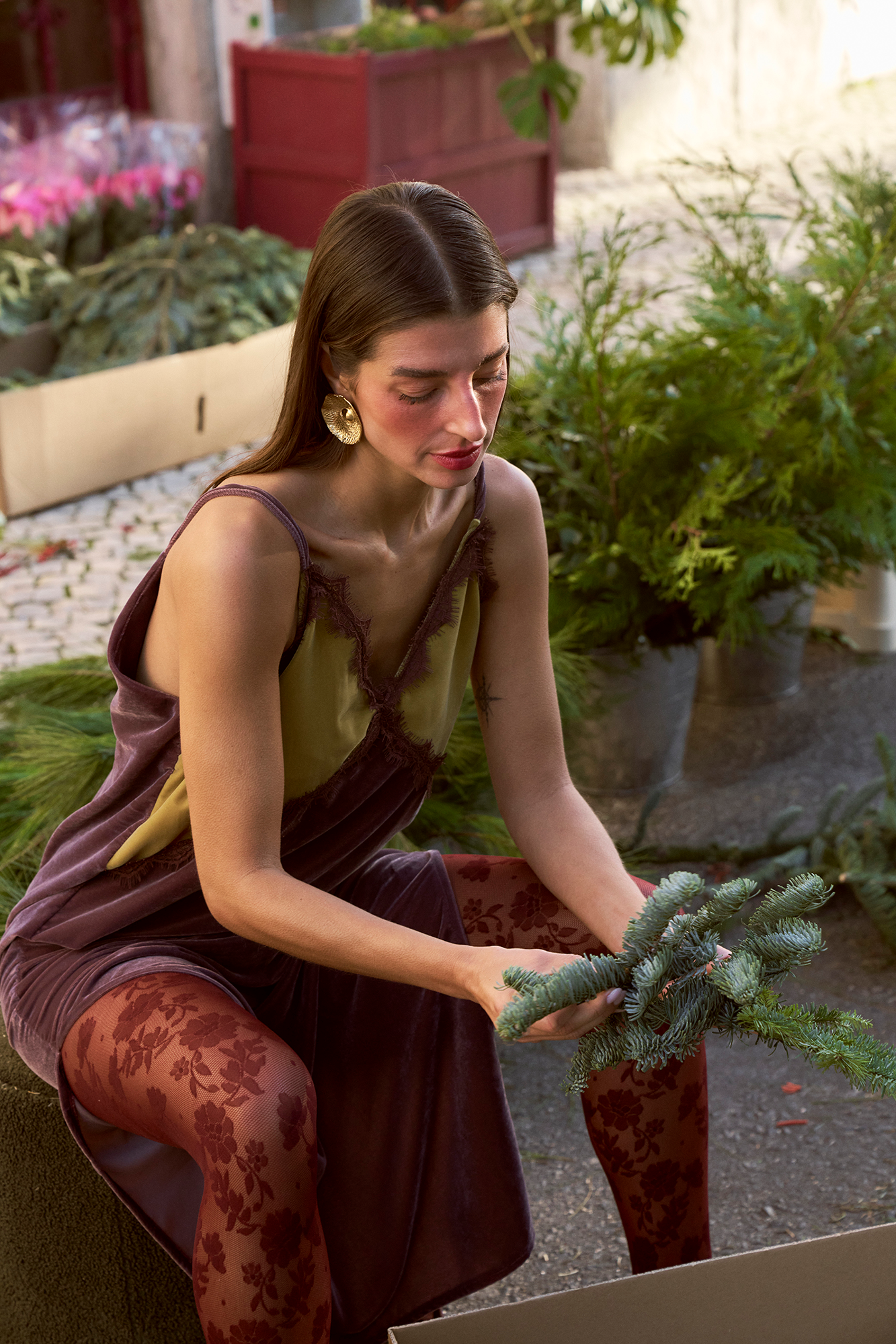 CARMO é um slip dress de veludo em color block, com aplicação de renda no decote e nas aberturas das laterais.