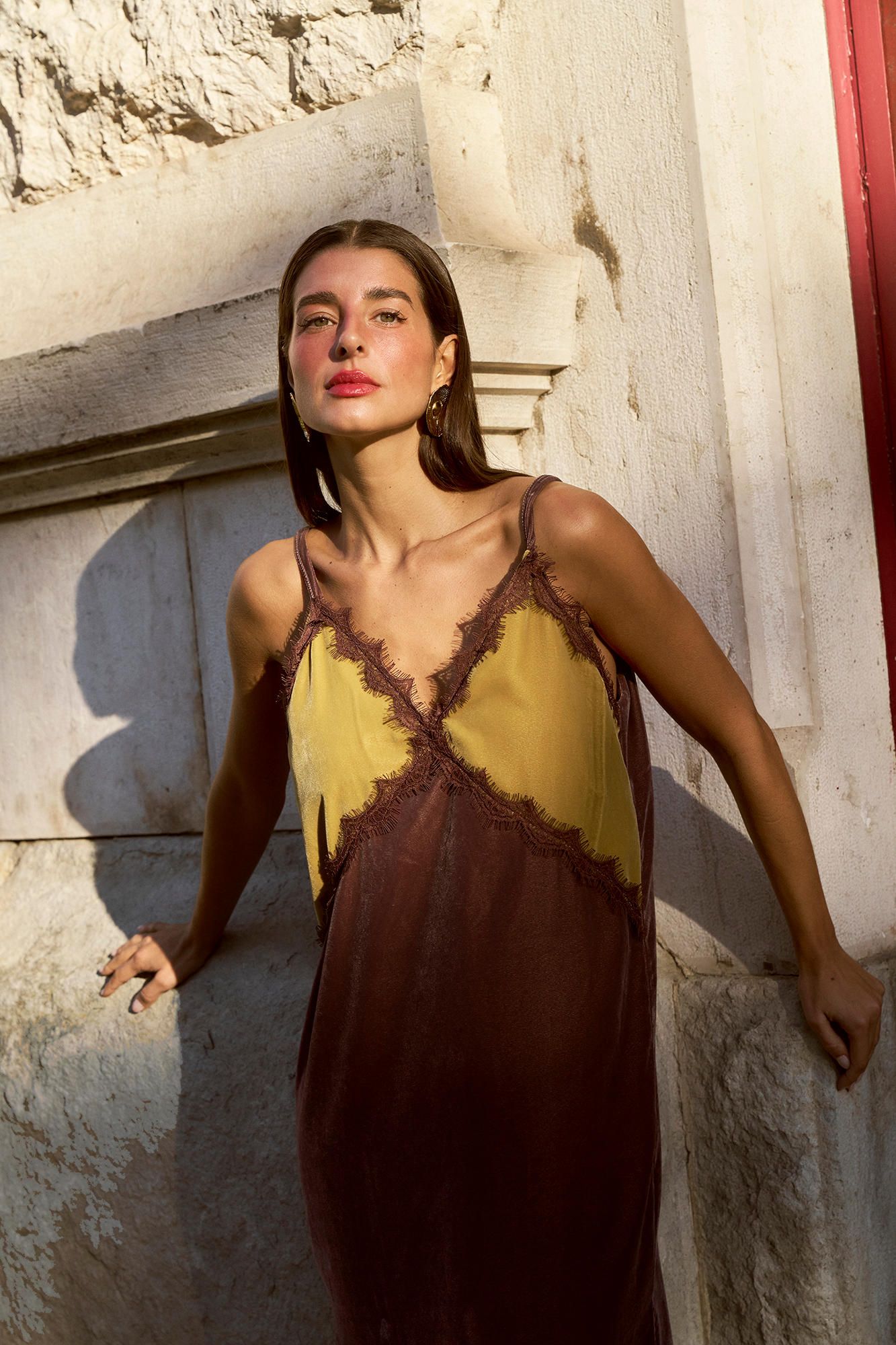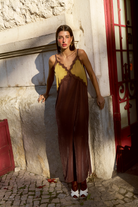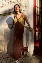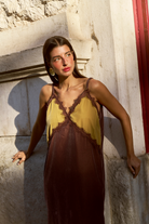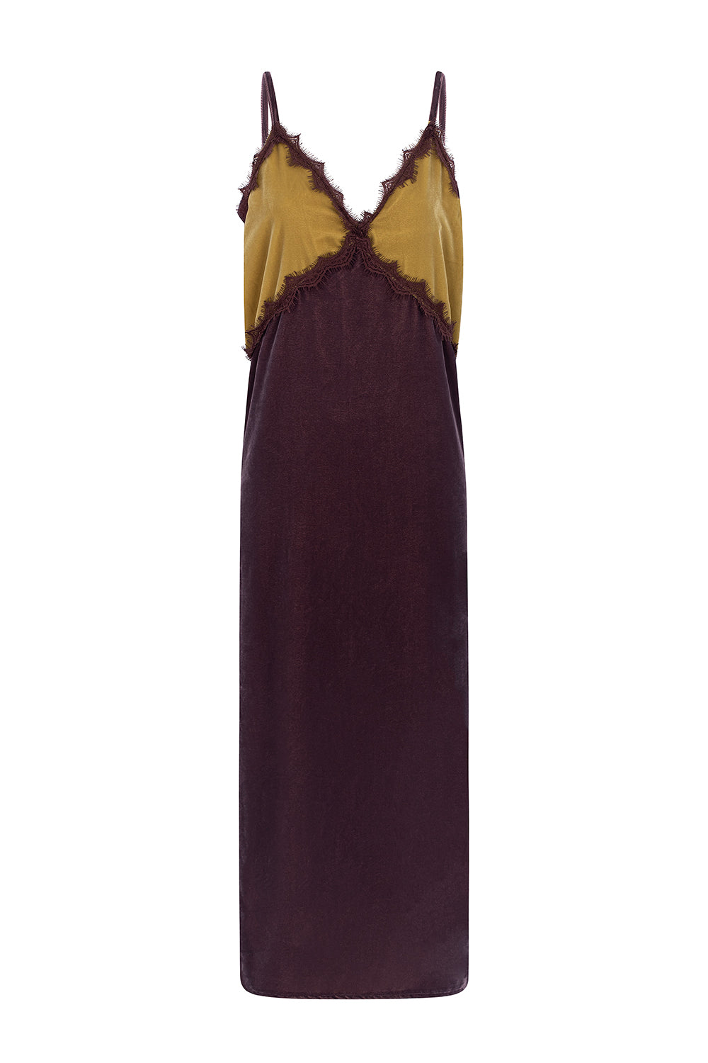 CARMO is a velvet slip dress in color block, with lace appliqué on the neckline and side slits.