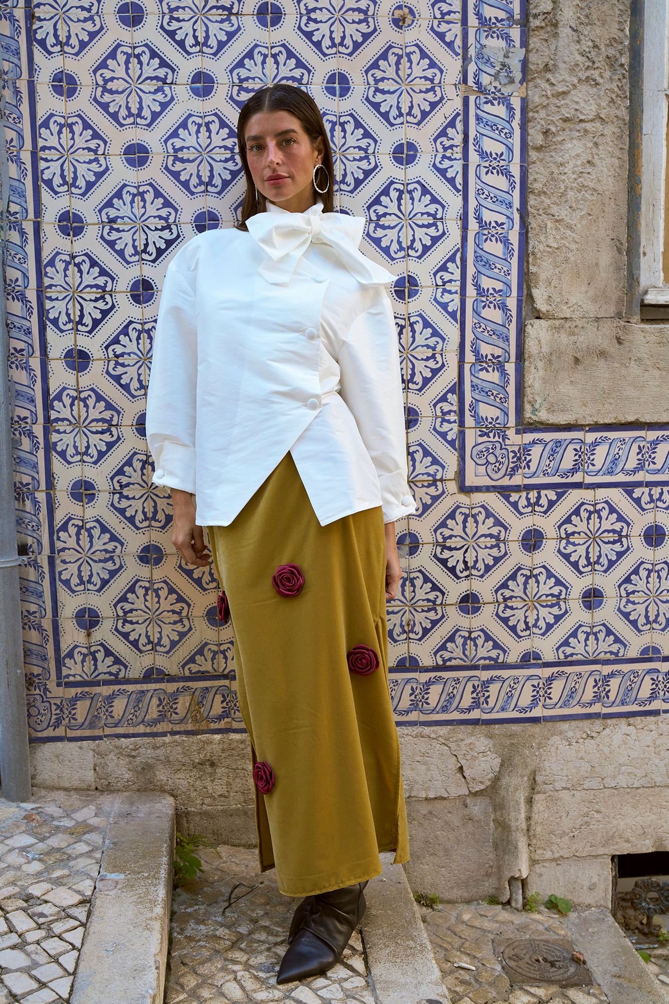 Estamos loucas com a saia MAD. Uma peça diferenciada, de cintura subida com fecho e silhueta lápis, bem como aplicação de flores na zona frontal.