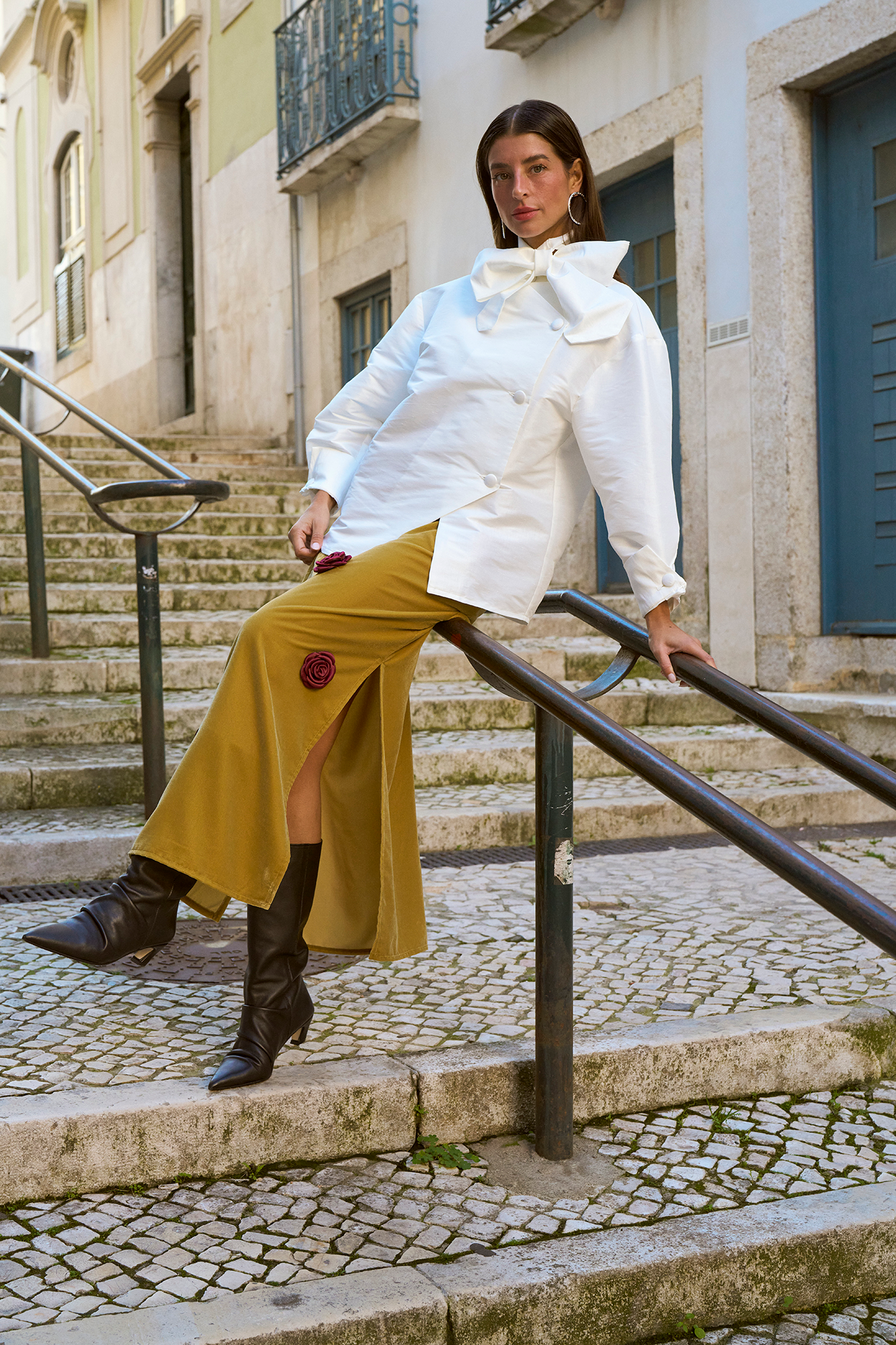 Feminina e fluída, esta saia em veludo fica bem com a camisa HATTER.