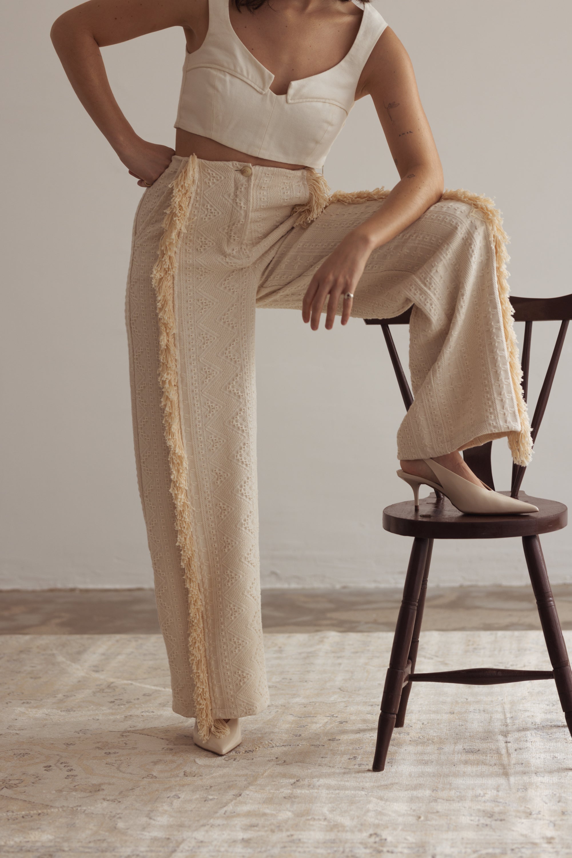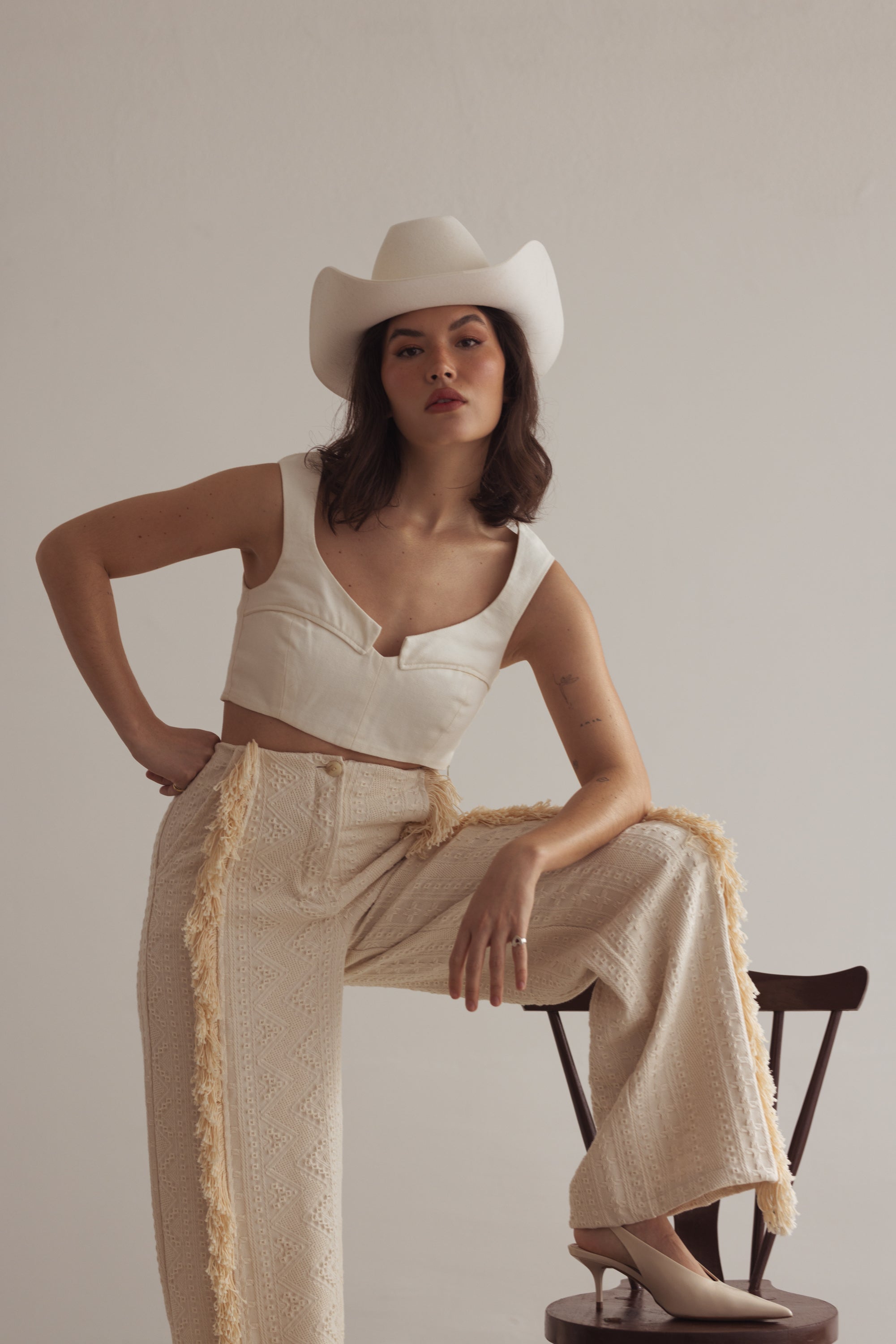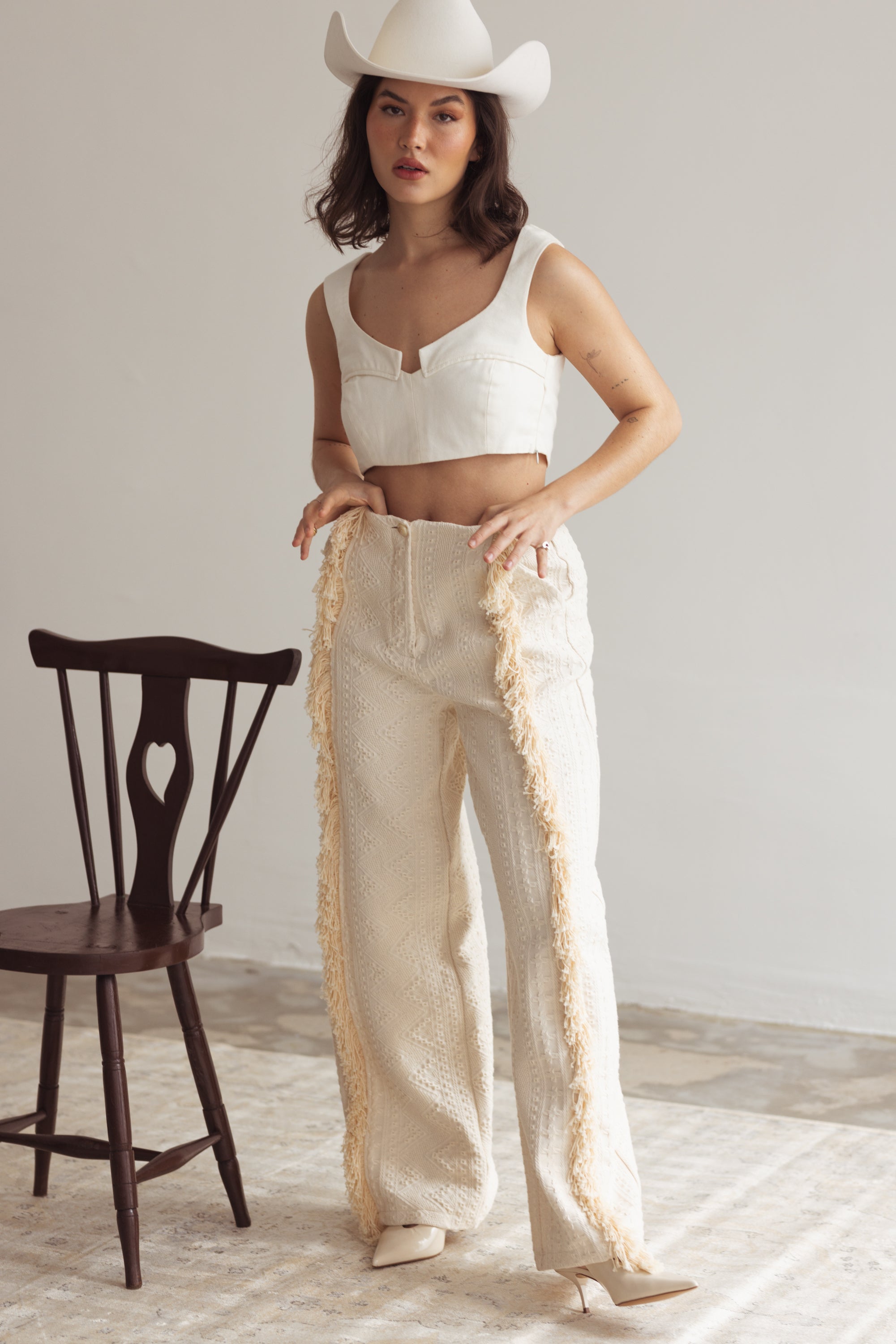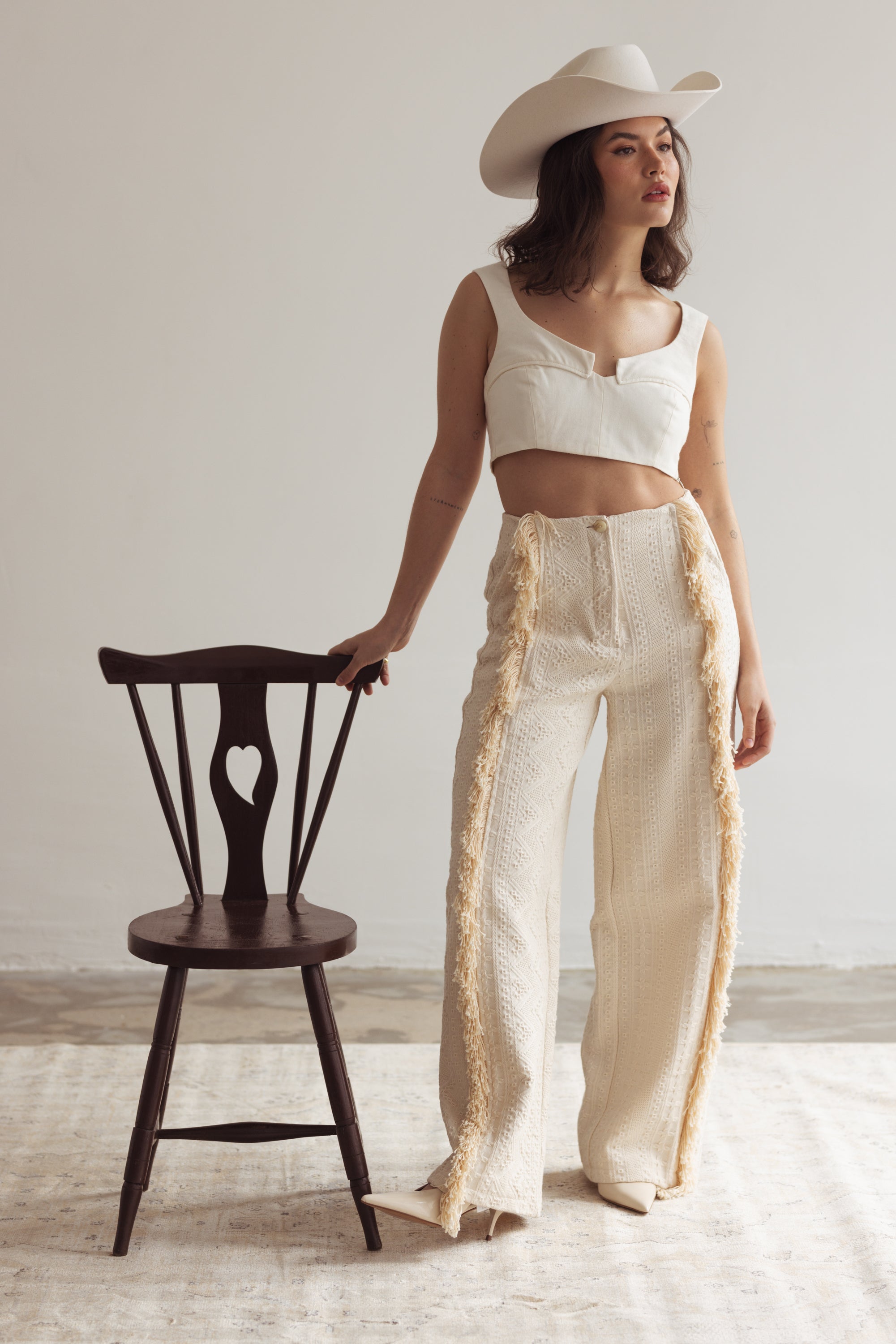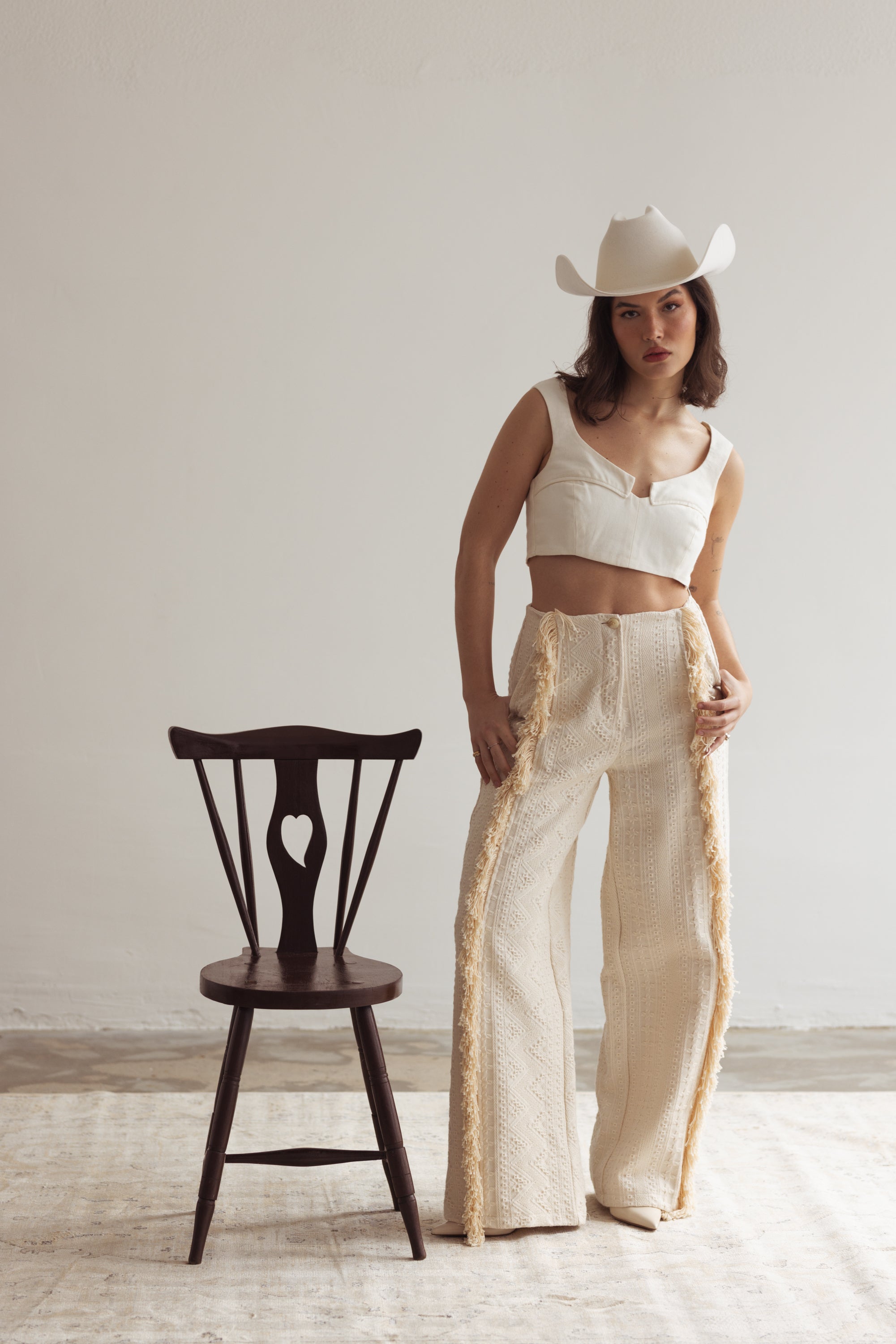 Our DJANGO trousers are the mood of the RODEO collection. With a straight cut and fringes on the side, these trousers made of textured fabric are perfect to combine with the jacket of the same set or with our HAVANA crop top.