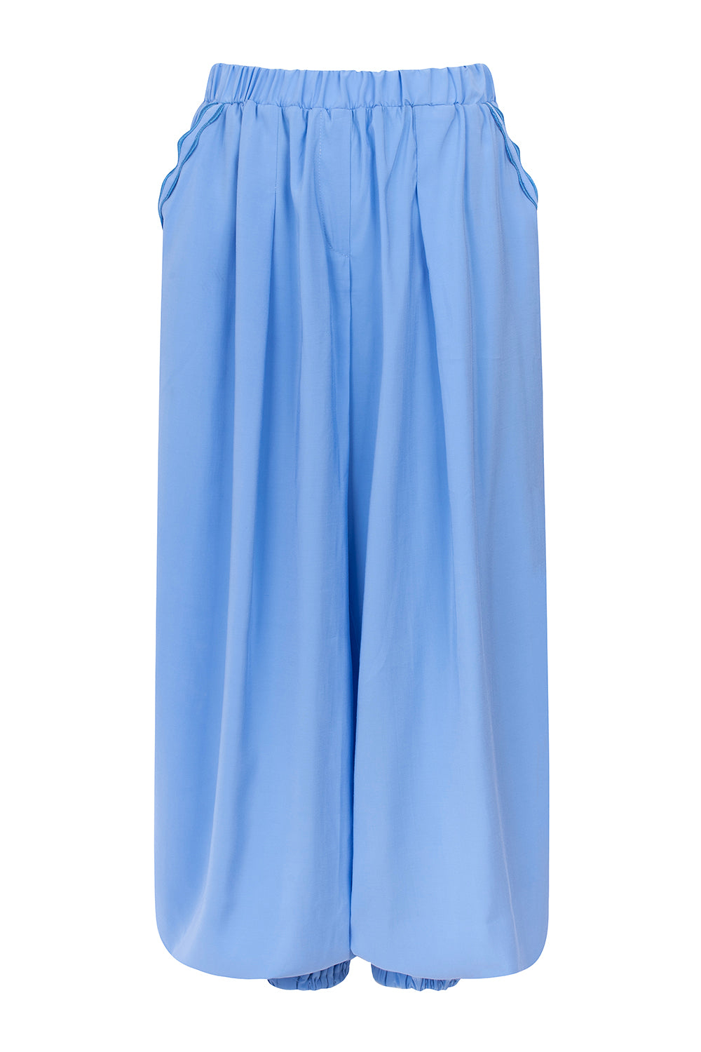 Flowy, with elastic at the ankles and waist, these balloon-shaped trousers also have an embroidered detail on the side pockets.