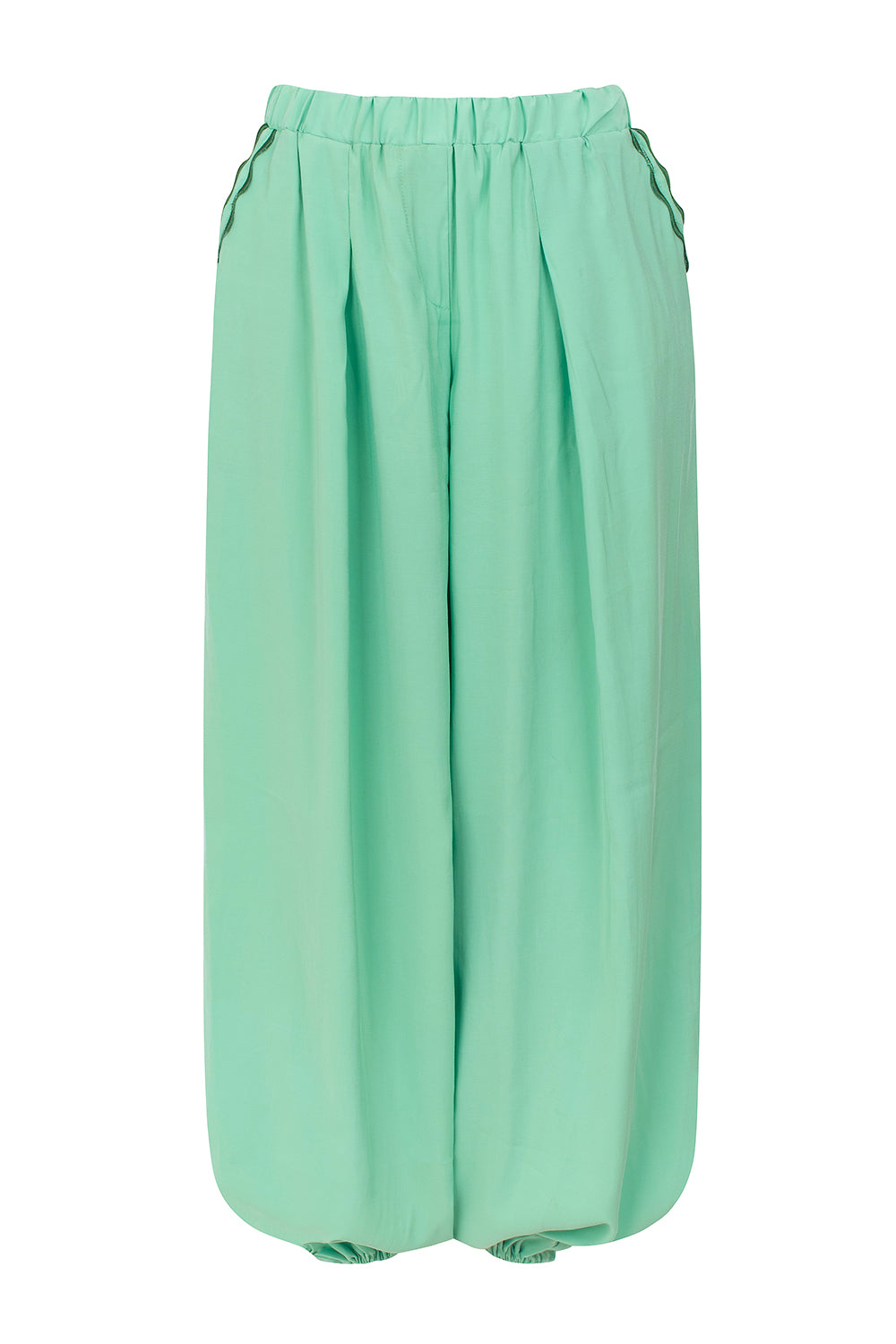 Flowy, with elastic at the ankles and waist, these balloon-shaped trousers also have an embroidered detail on the side pockets.