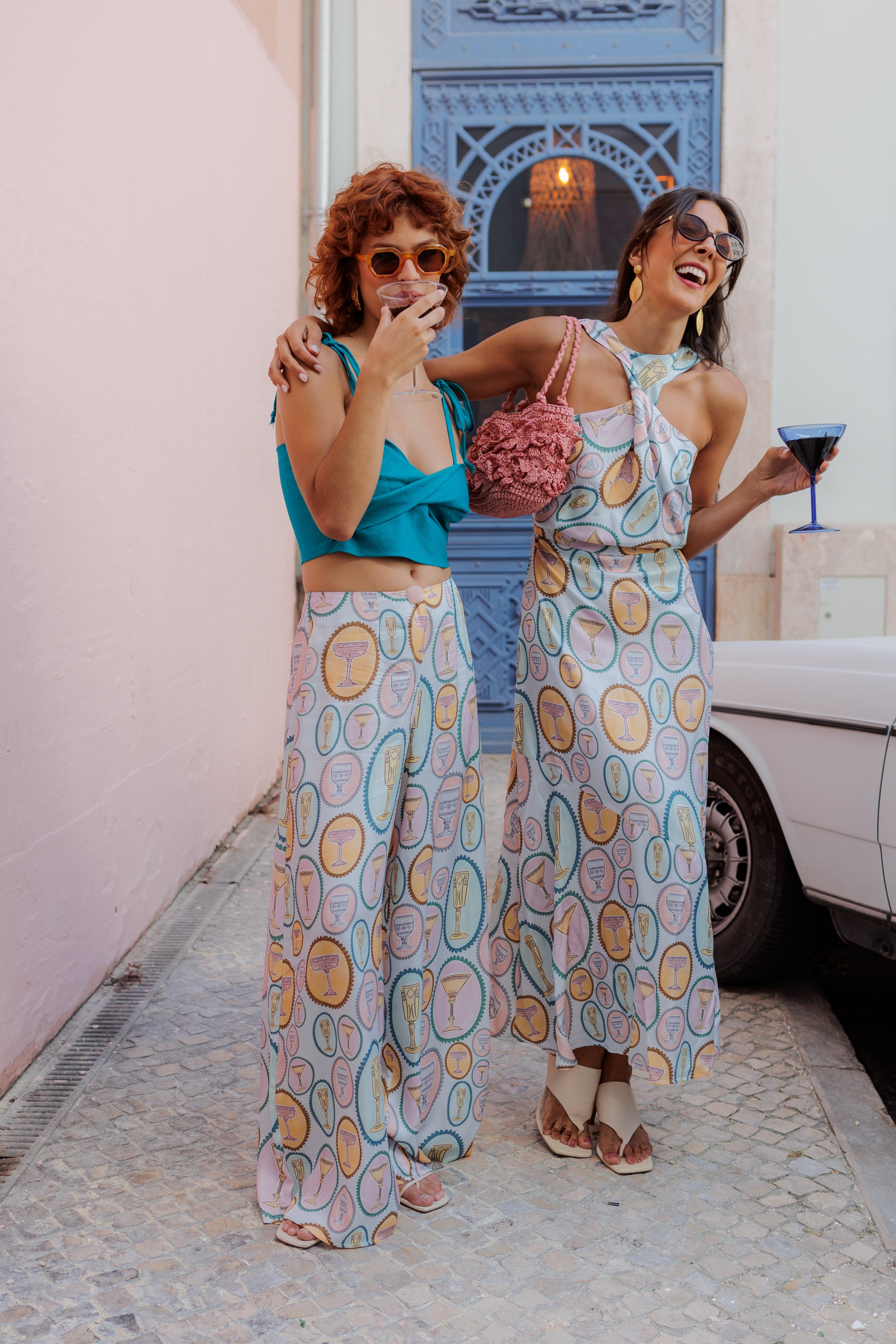 With their wide-leg cut and a pattern inspired by the different glasses of our favourite parties, these trousers can be worn with our FRANCESCA top.