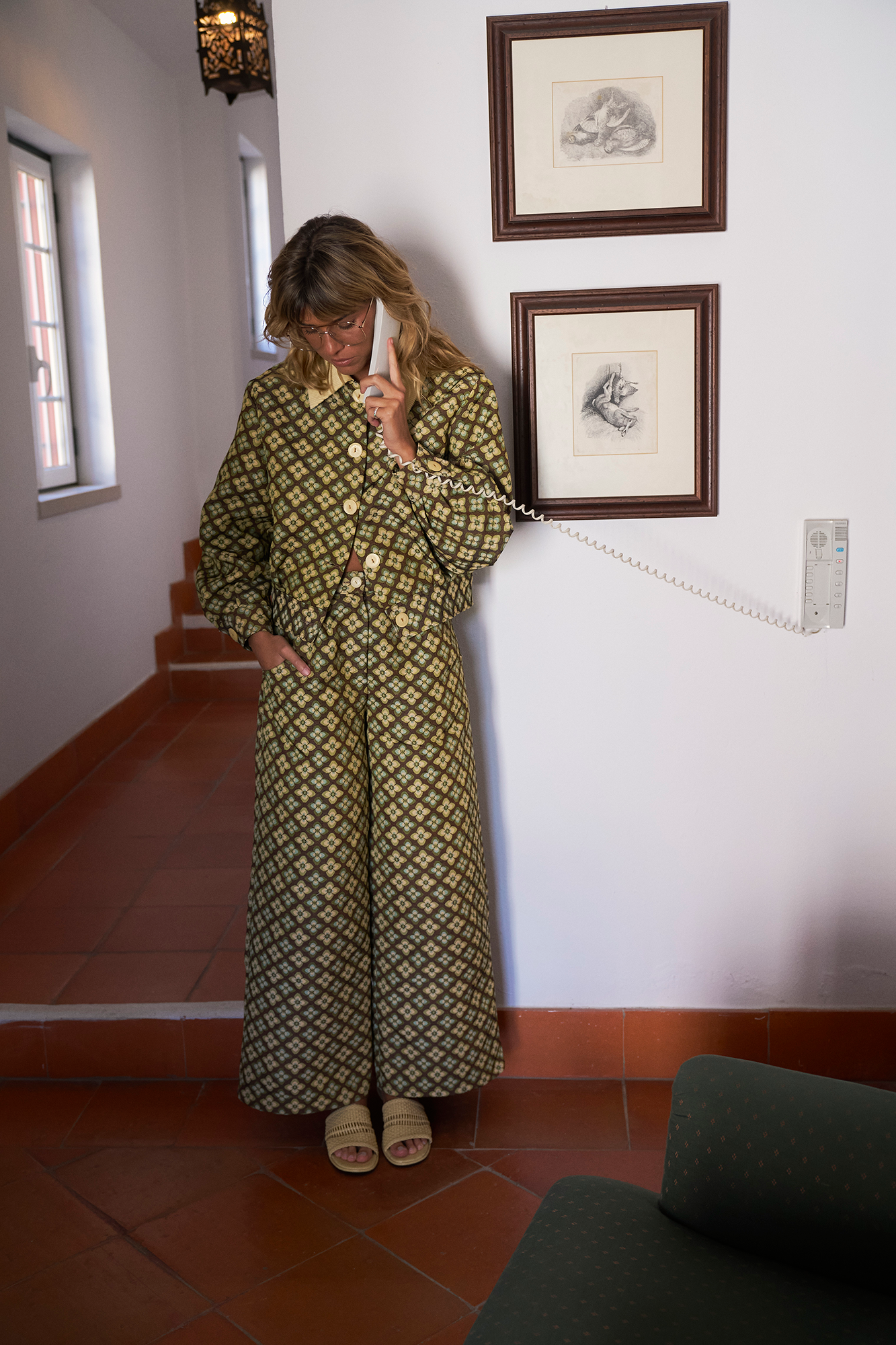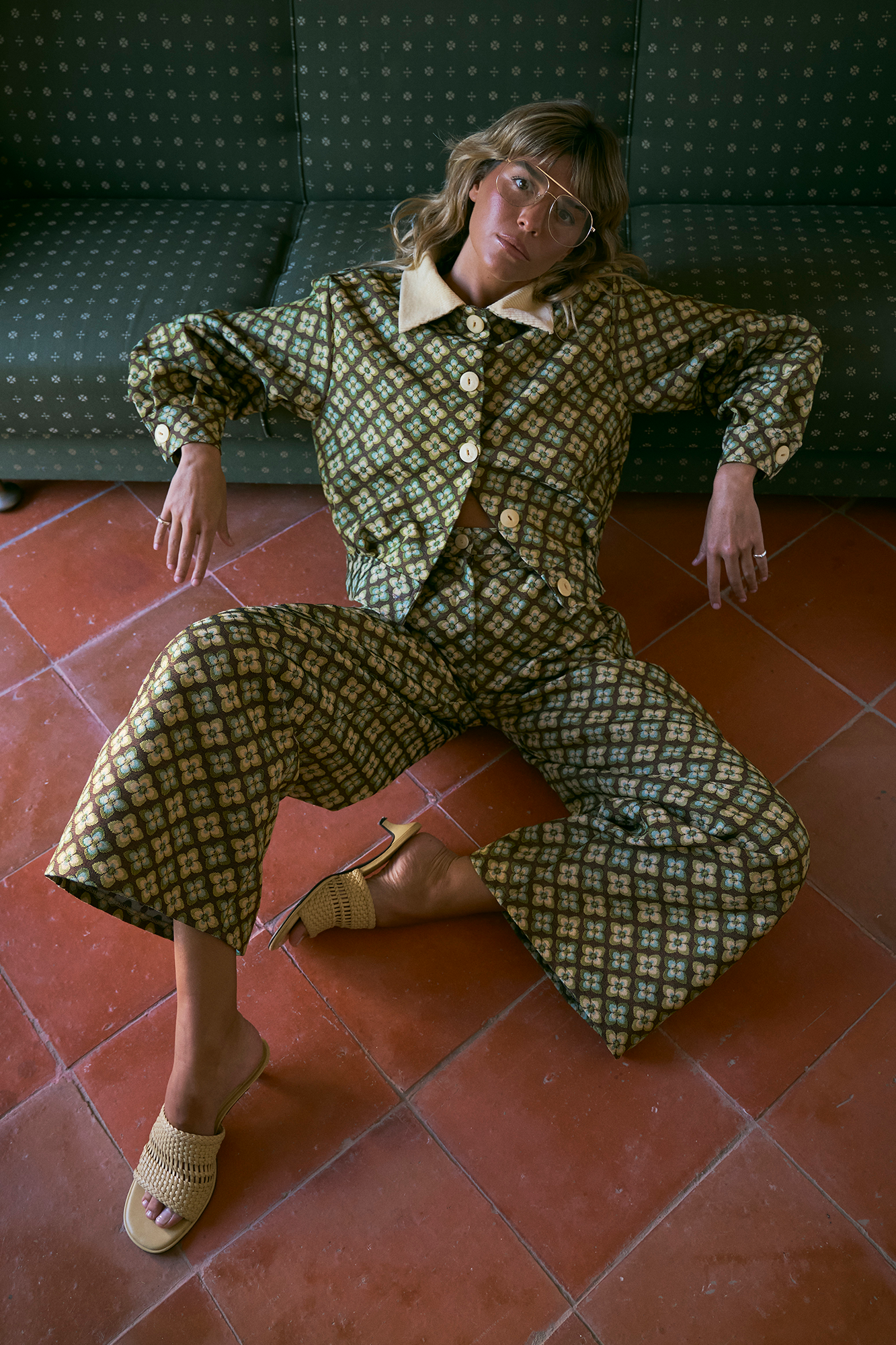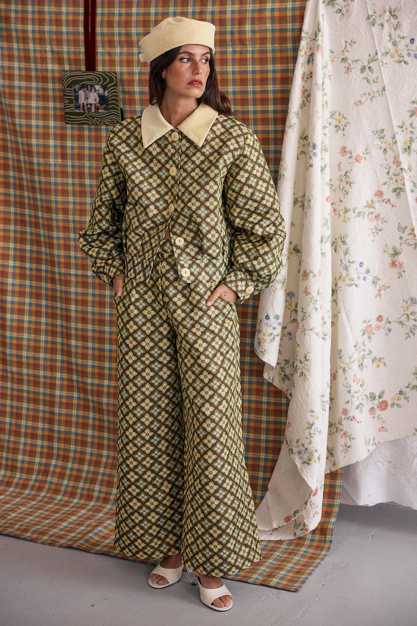 O tecido jaquard com padrão floral inspira-se nos sofás das casas das avós, trazendo memórias de conforto e aconchego.