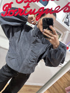 QUEEN é um oversized bomber jacket com mangas morcego e gola alta, feito em bombazina quente e perfeita para os dias mais frios.