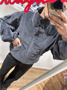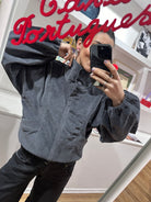 An oversized bomber with batwing sleeves and a high collar, crafted in corduroy that plays with texture and light. The front zipper and pockets make it practical yet effortlessly stylish. A warm, striking piece, perfect for chilly days with elegance and ease.