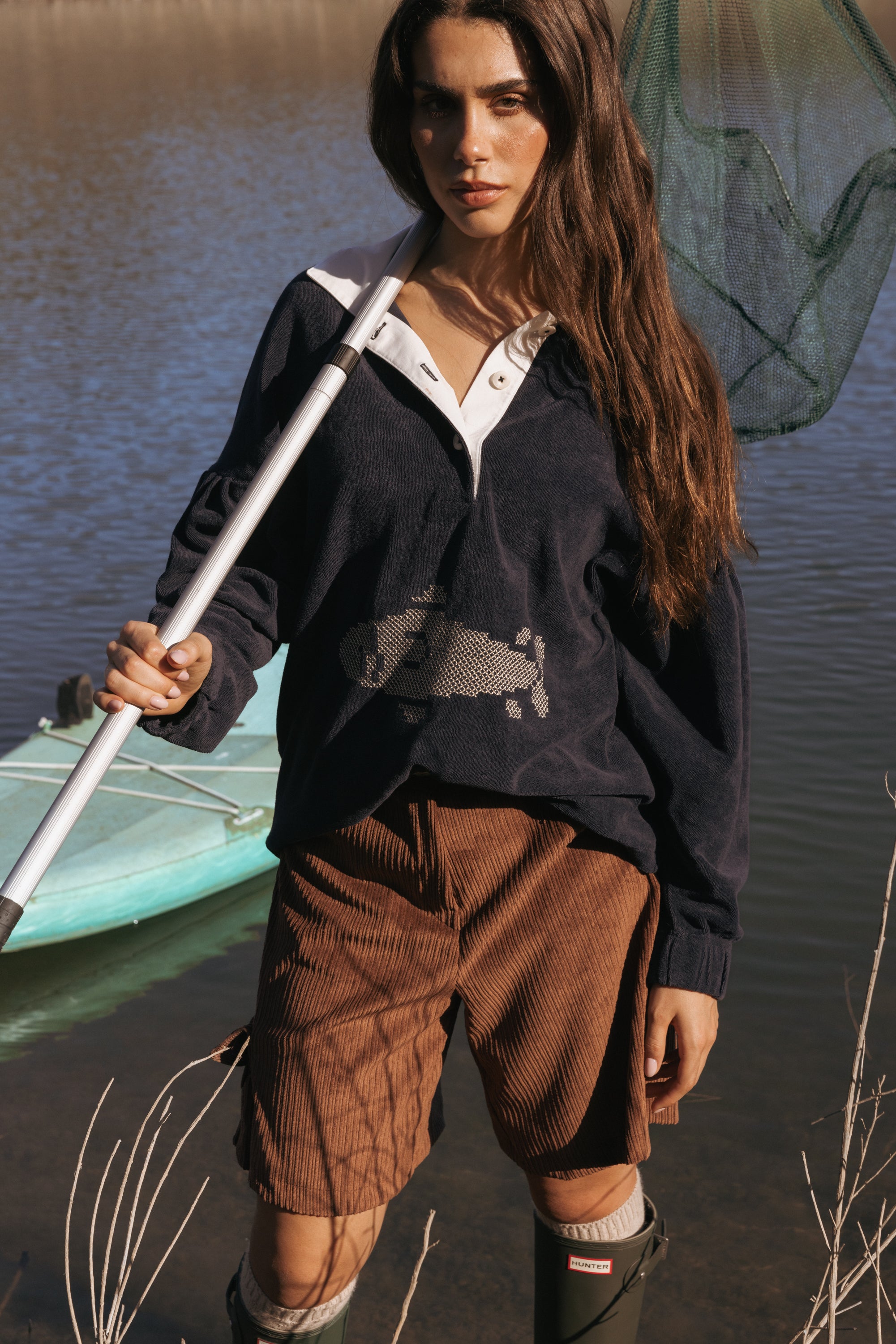 ALFORD was a very idealized and dreamed piece. We love polo shirts but we wanted something different from what we usually see on the streets. That's why we designed a polo shirt with pleated shoulder sleeves, a white cotton collar and an oversized fit.