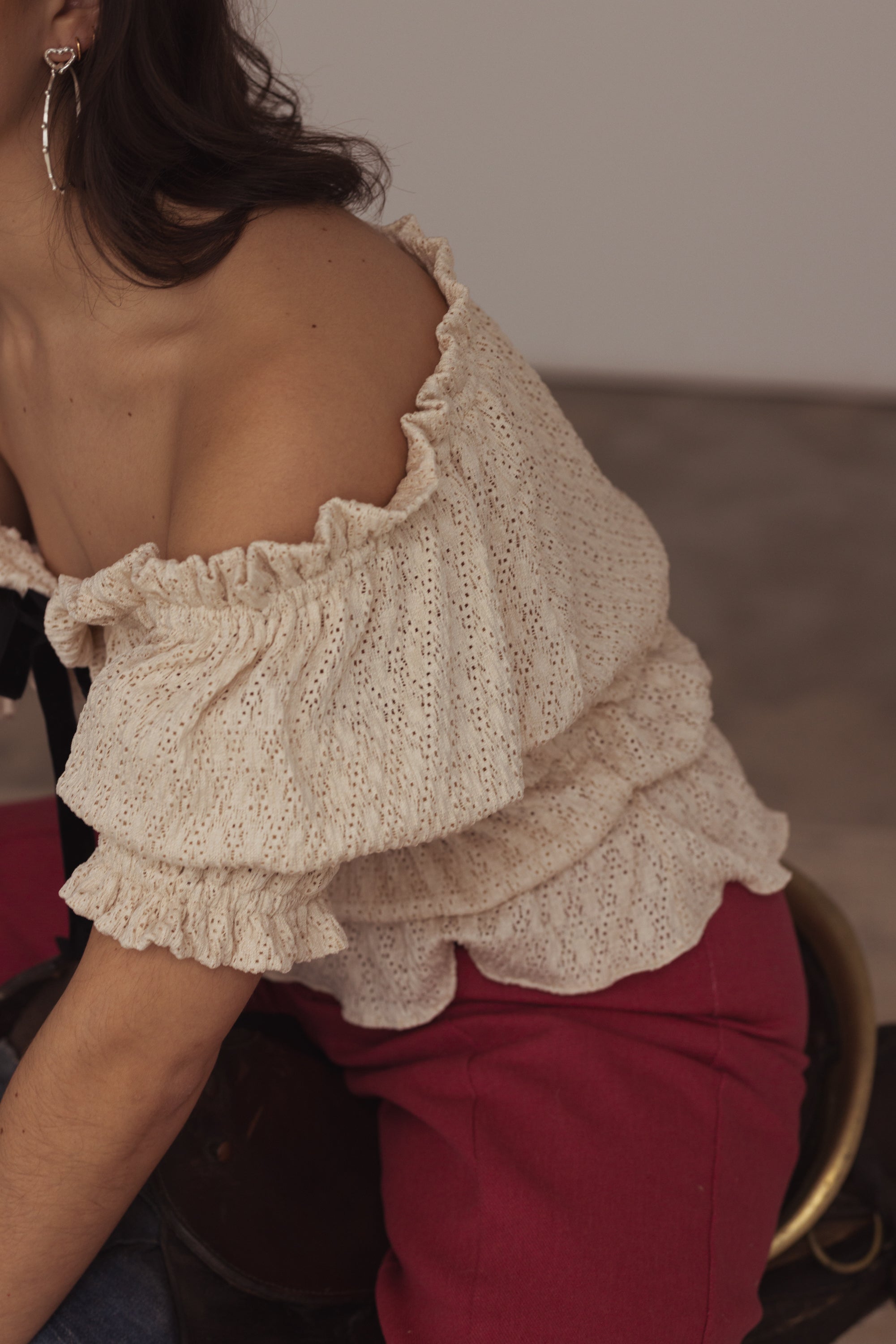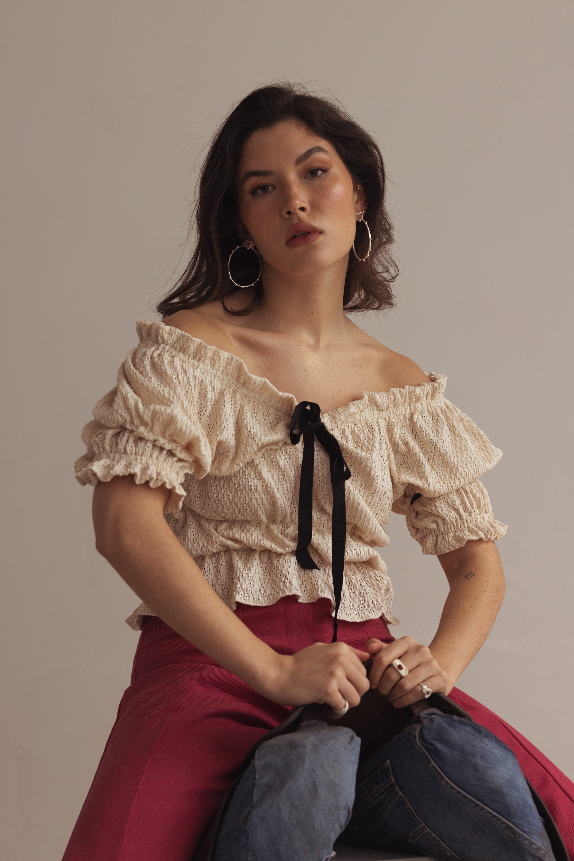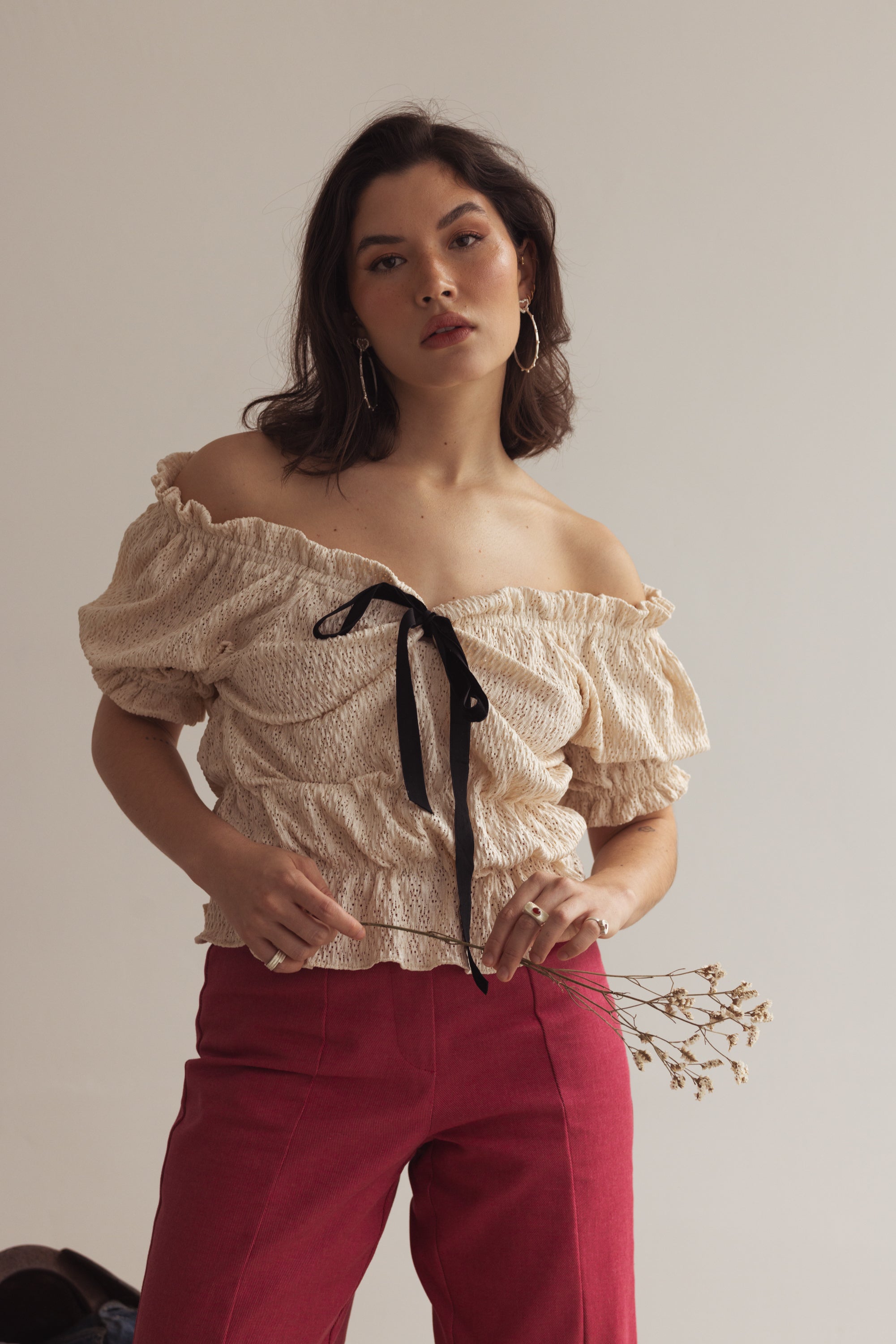 Our blouse ANNIE is feminine, romantic and cowgirl inspired. With several elastic bands and a velvet ribbon in the center, this blouse pairs perfectly with any of the DALLAS pants.