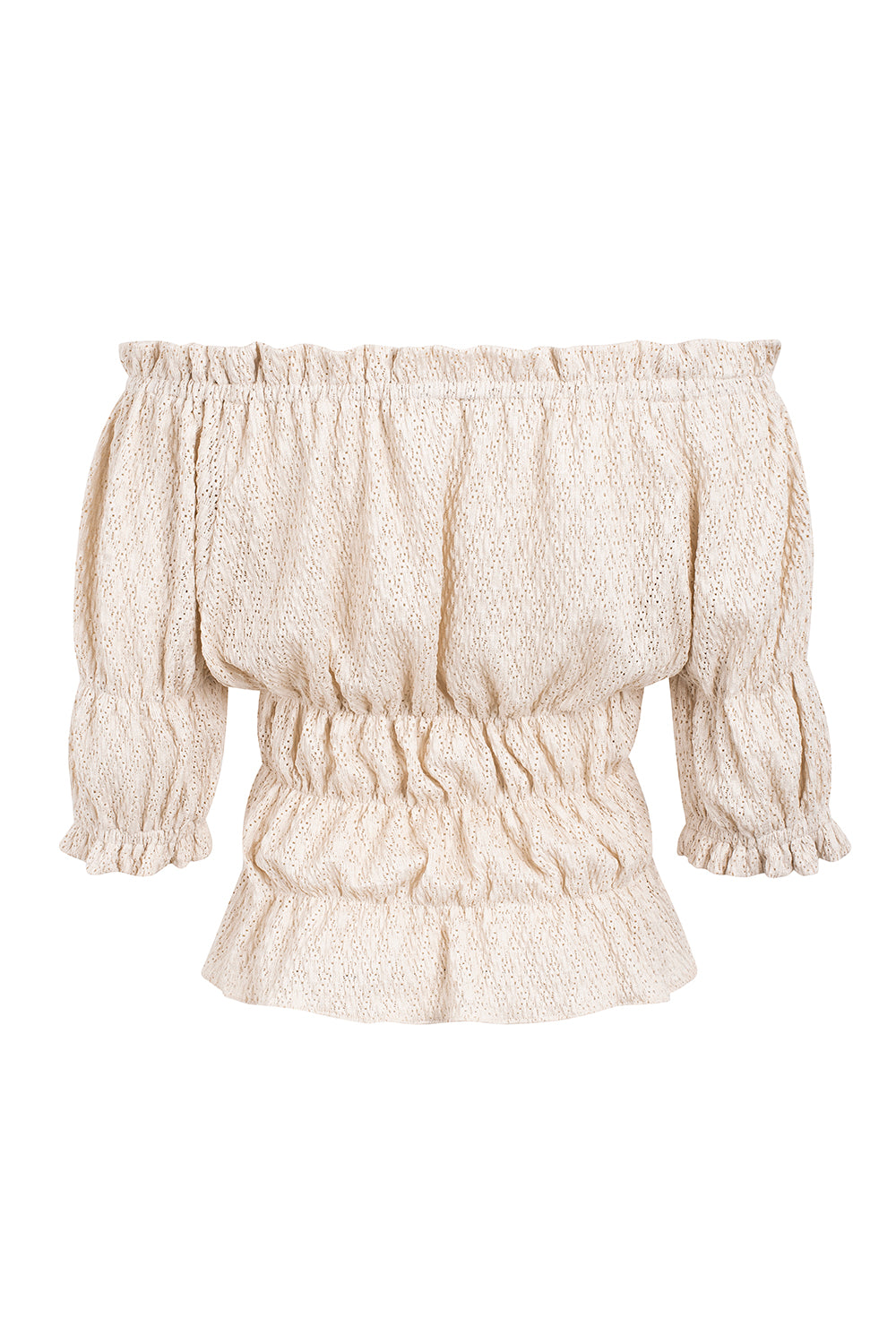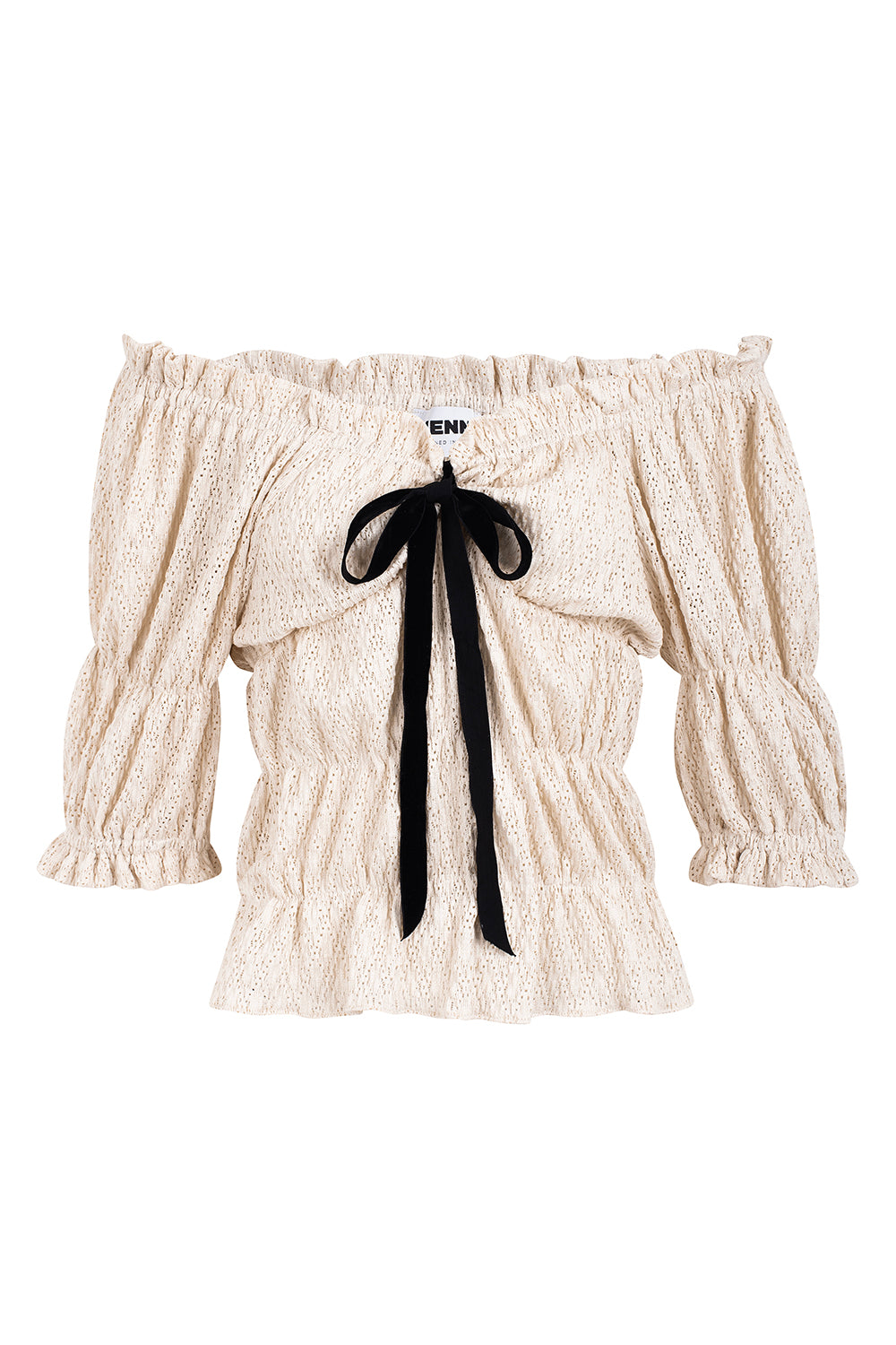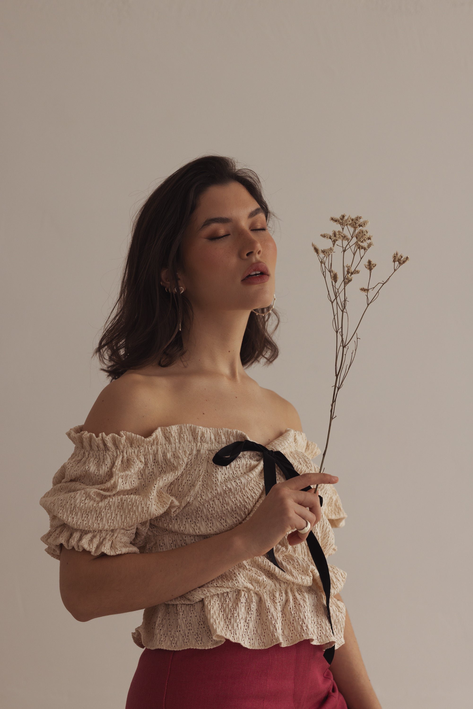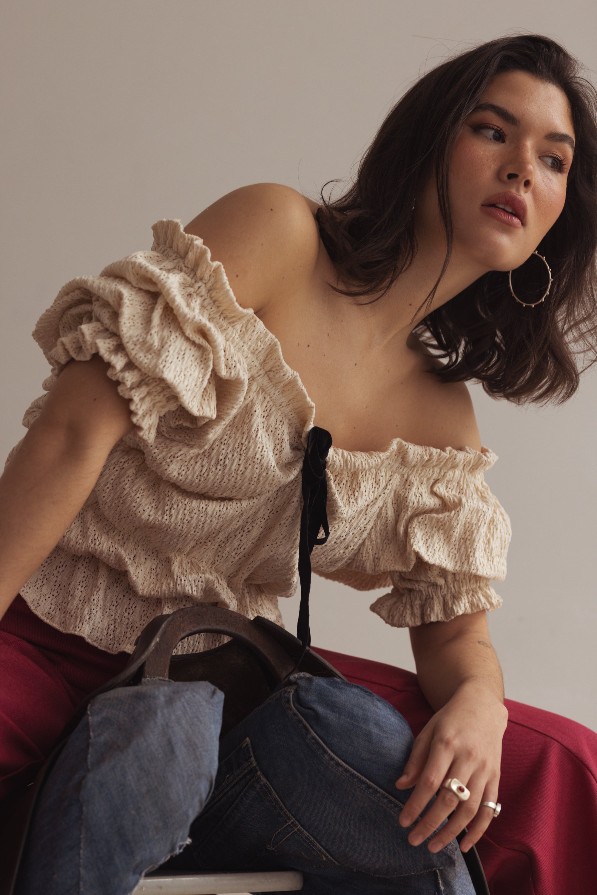 Our blouse ANNIE is feminine, romantic and cowgirl inspired. With several elastic bands and a velvet ribbon in the center, this blouse pairs perfectly with any of the DALLAS pants.
