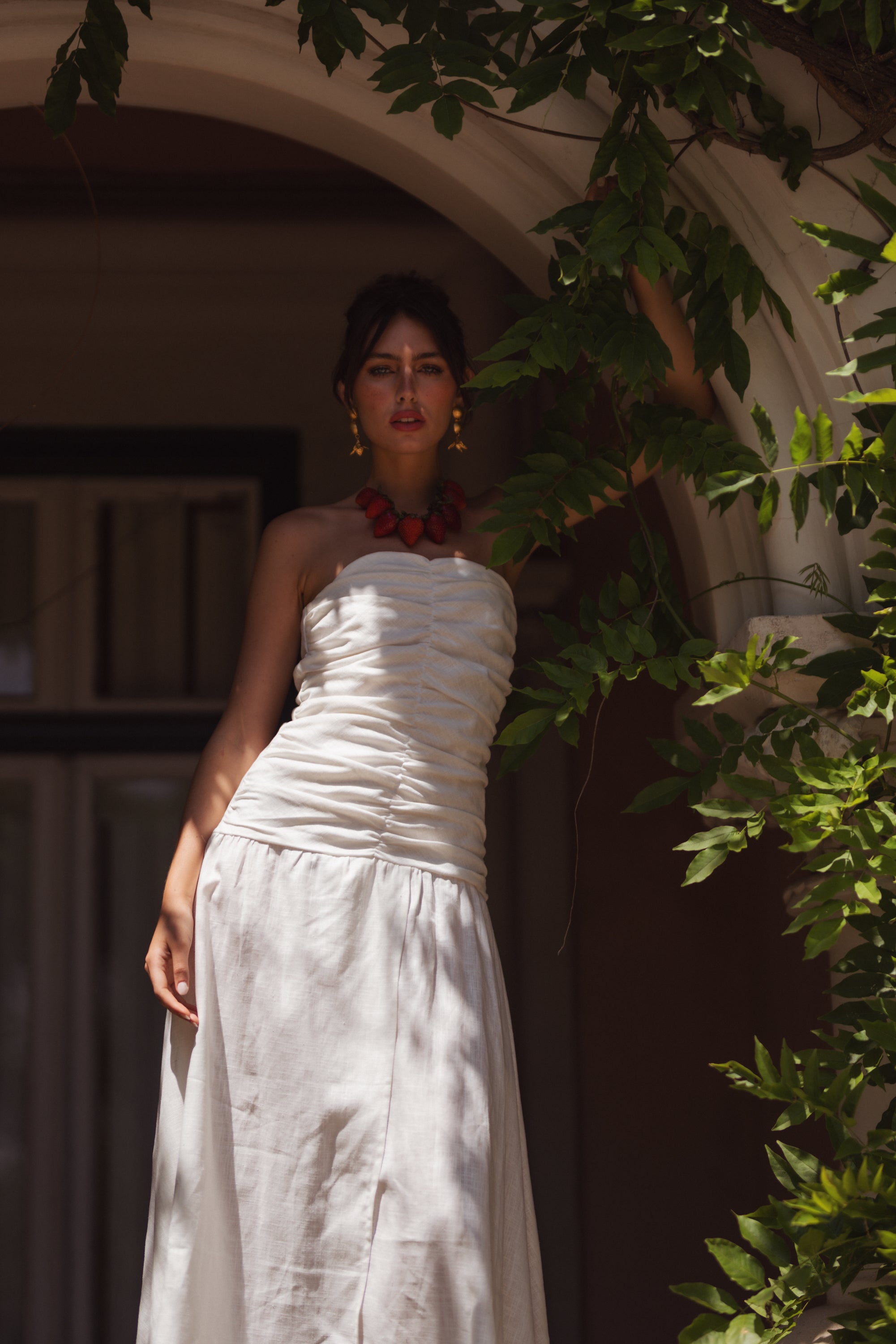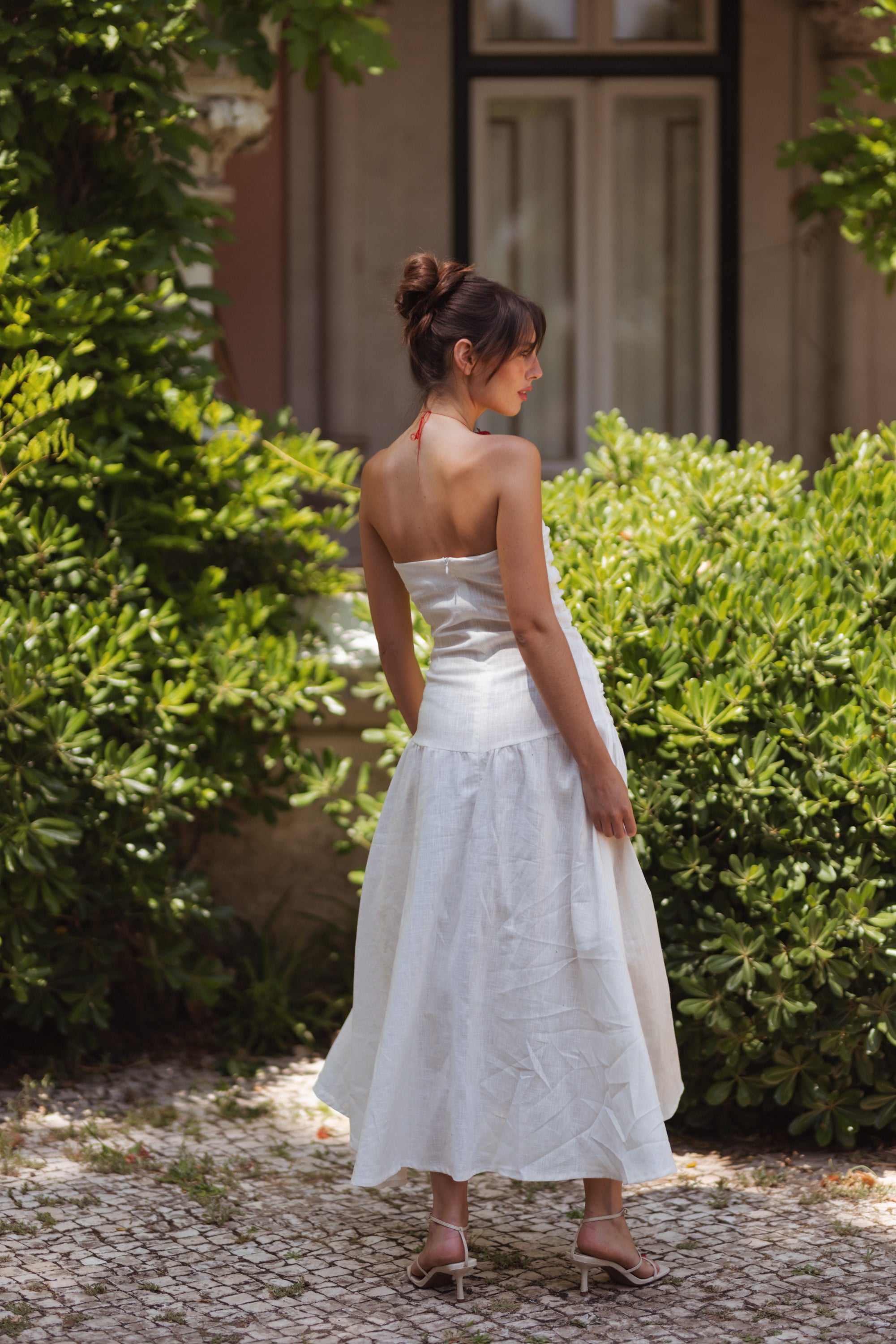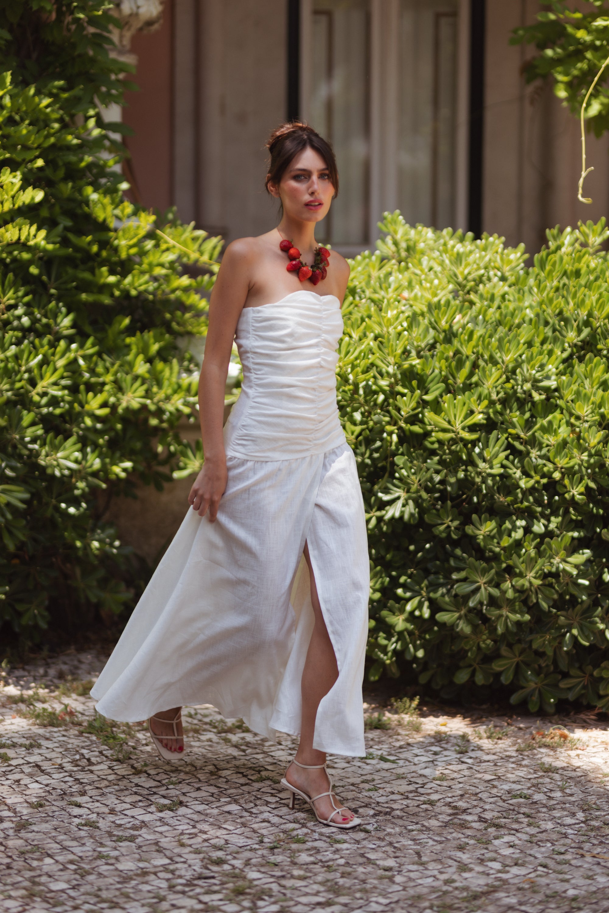 APHRODITE is the goddess of love and sensuality, responsible for maintaining life and happiness. Strapless, with a low waist and a double-breasted slit at the front, this dress named after this goddess will make you feel beautiful all summer long.