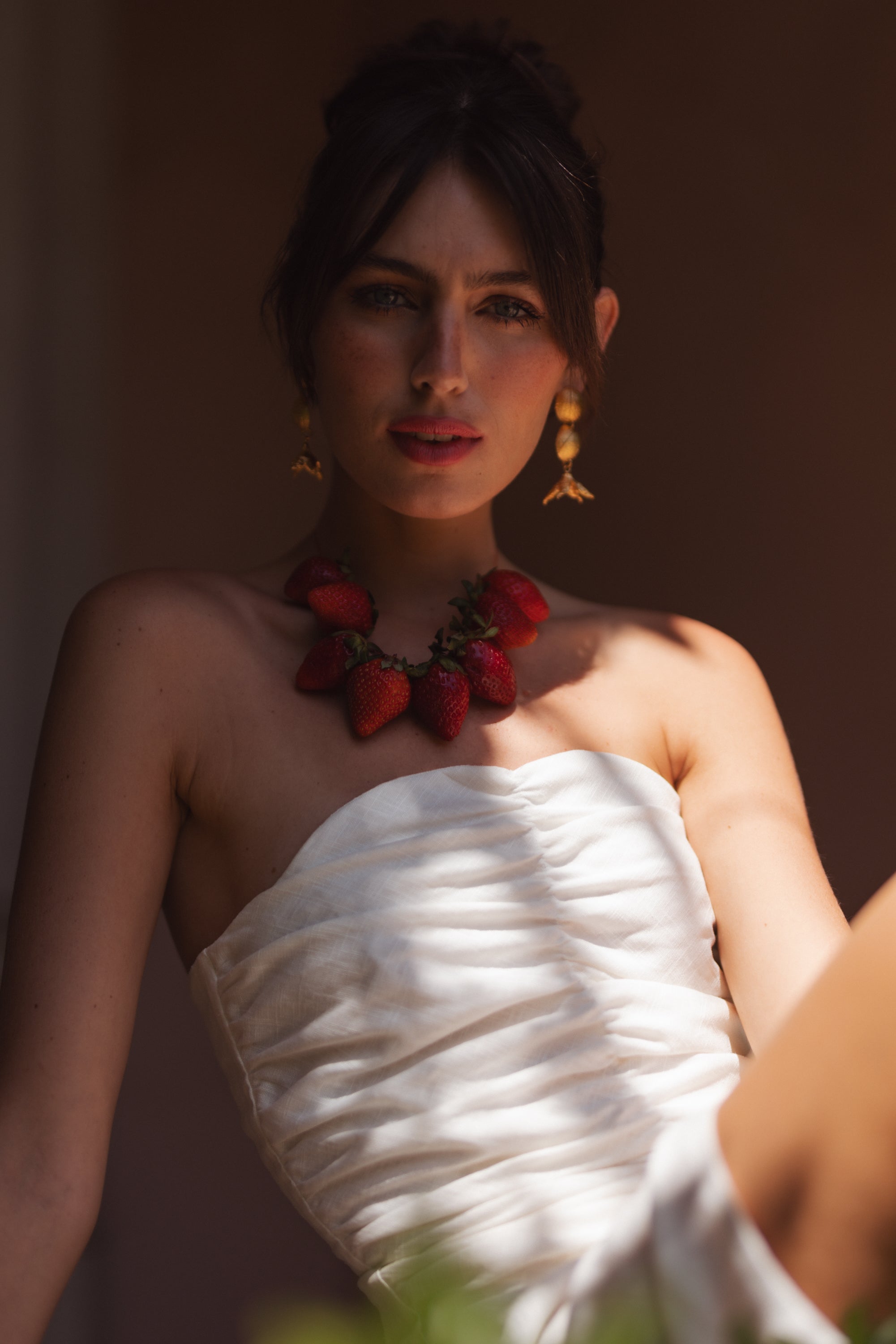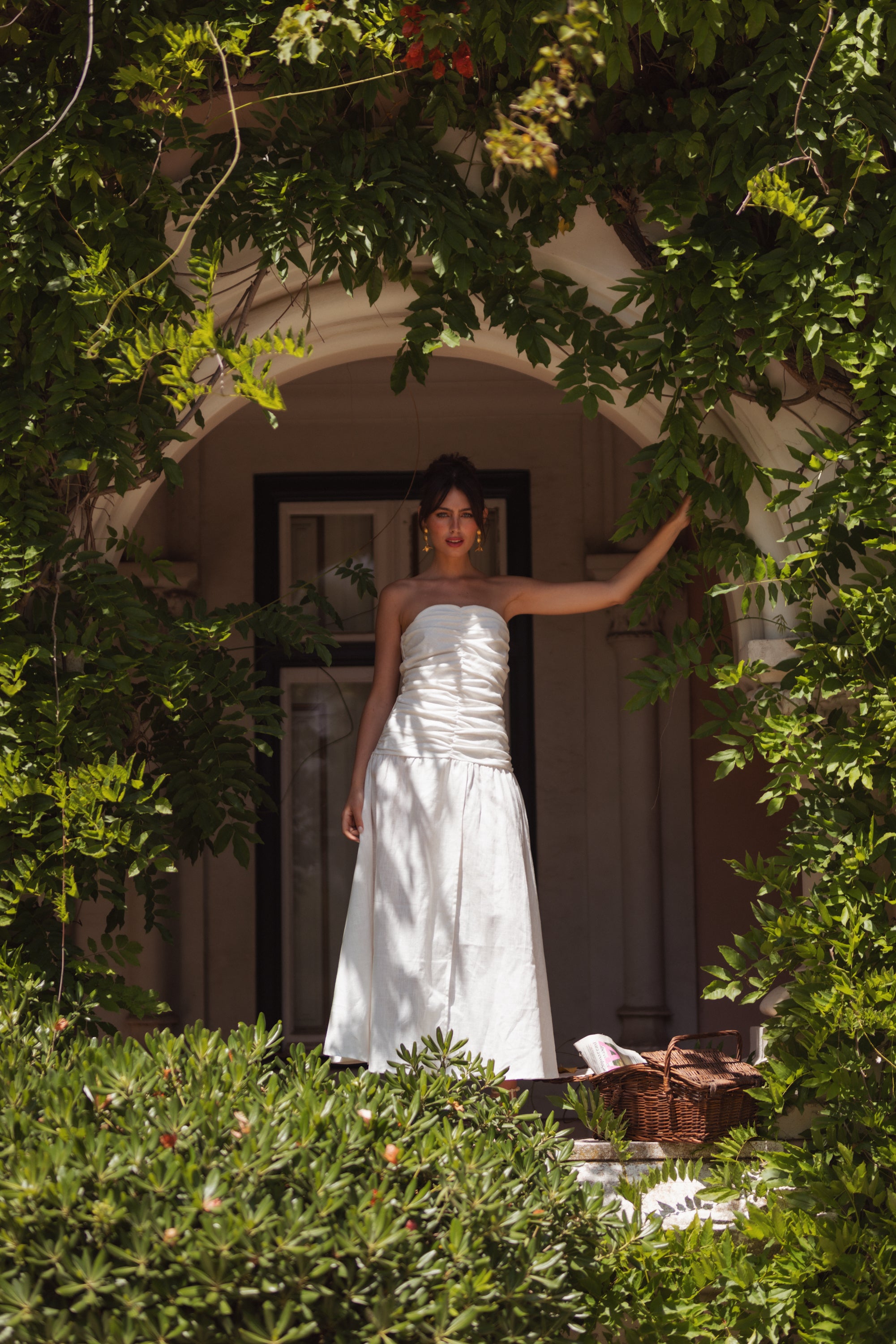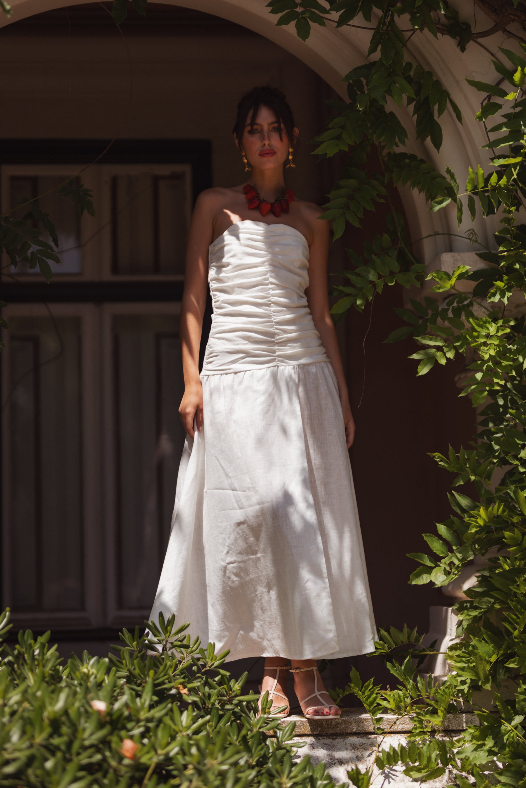 APHRODITE is the goddess of love and sensuality, responsible for maintaining life and happiness. Strapless, with a low waist and a double-breasted slit at the front, this dress named after this goddess will make you feel beautiful all summer long.