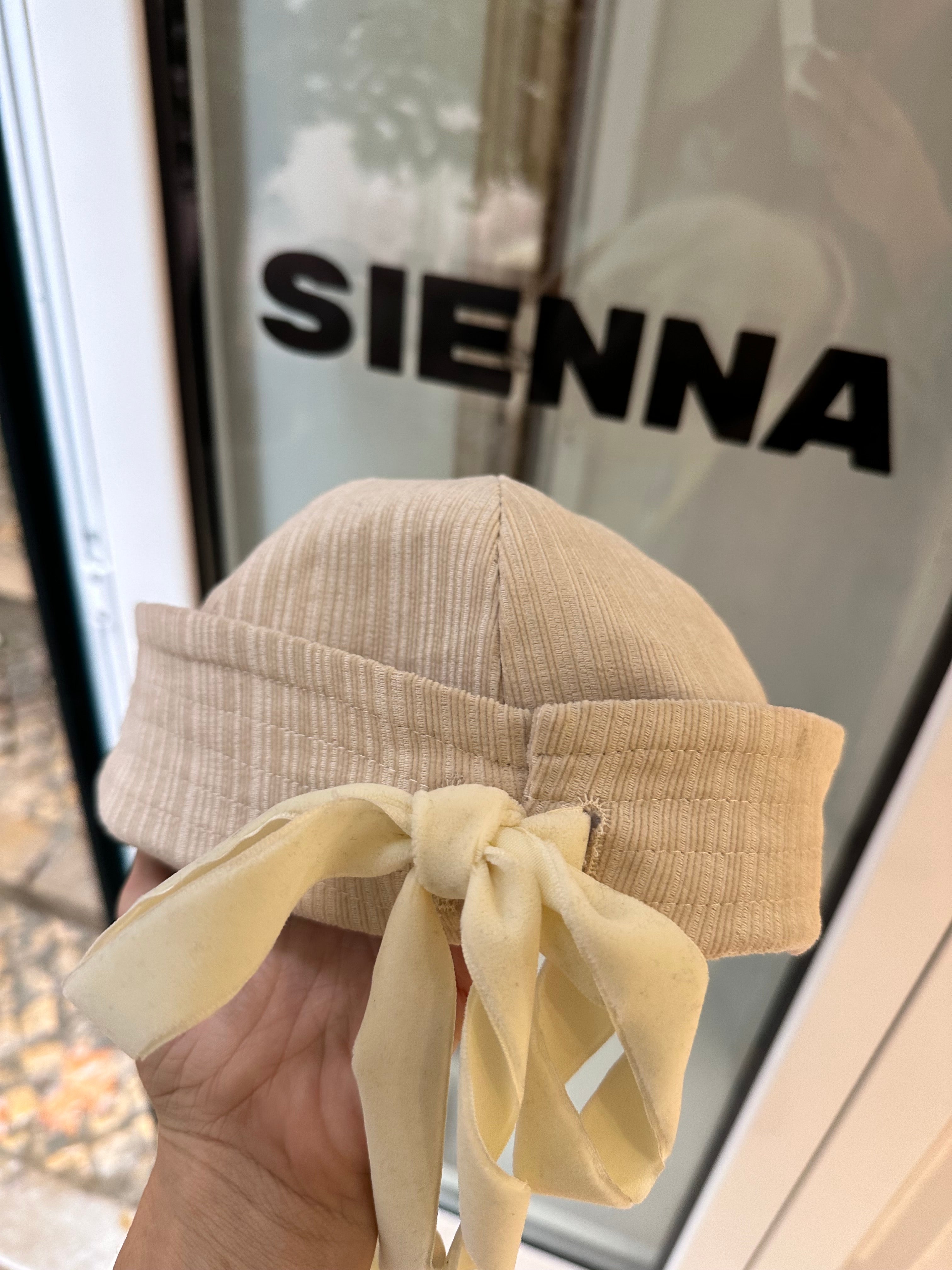 ASSUNÇÃO is a corduroy sailor-style hat with a bow at the back for easy adjustment.