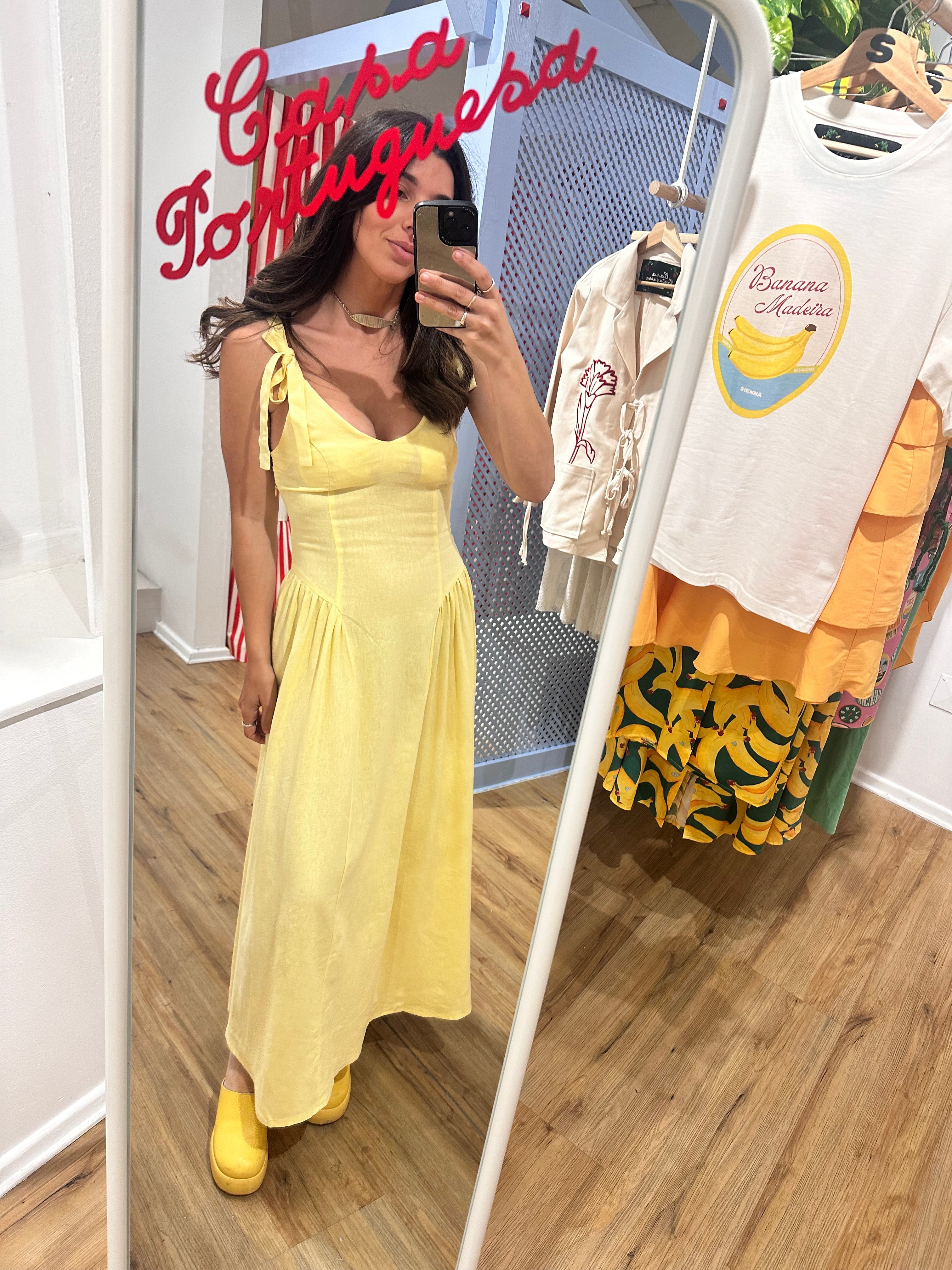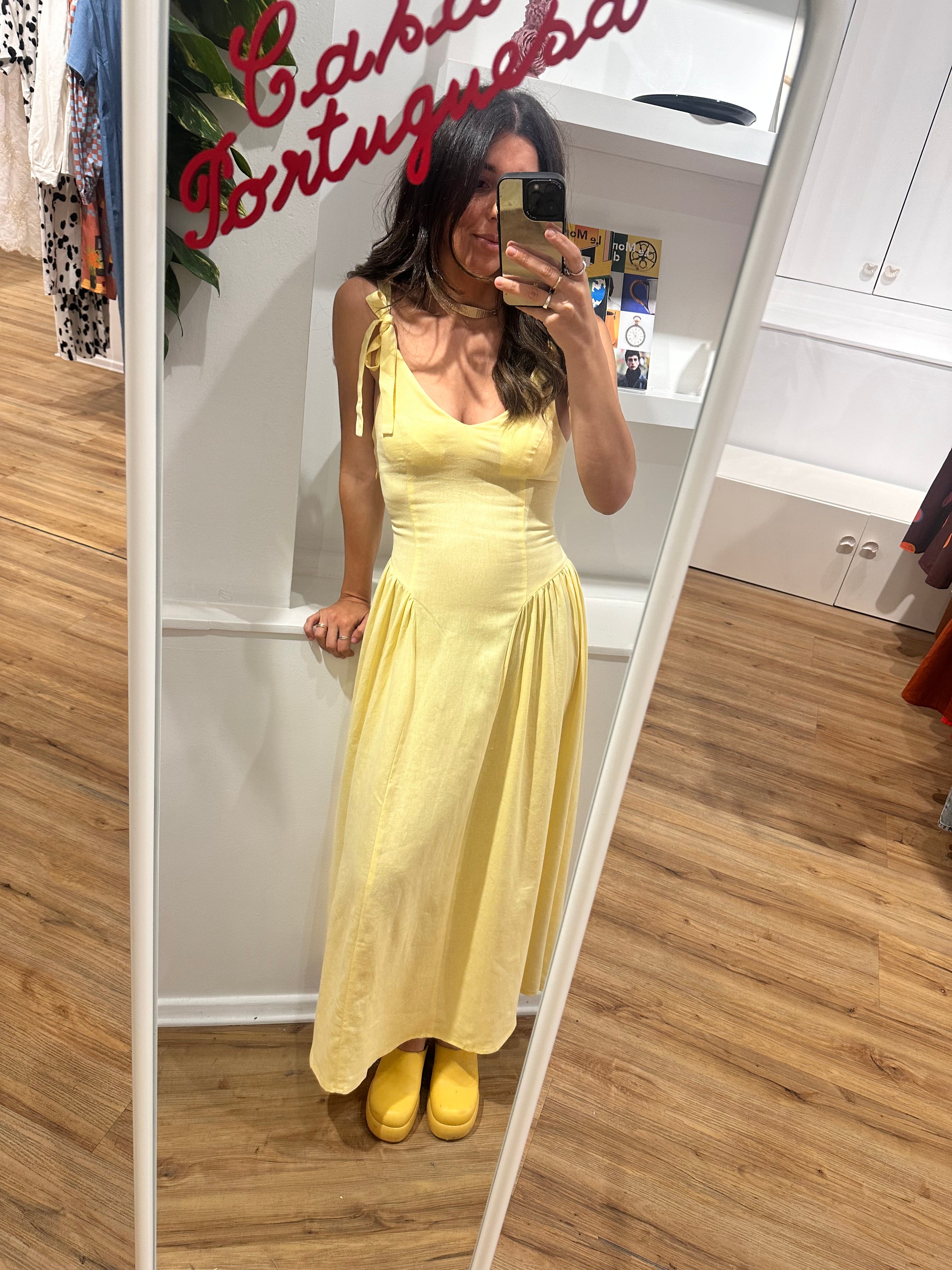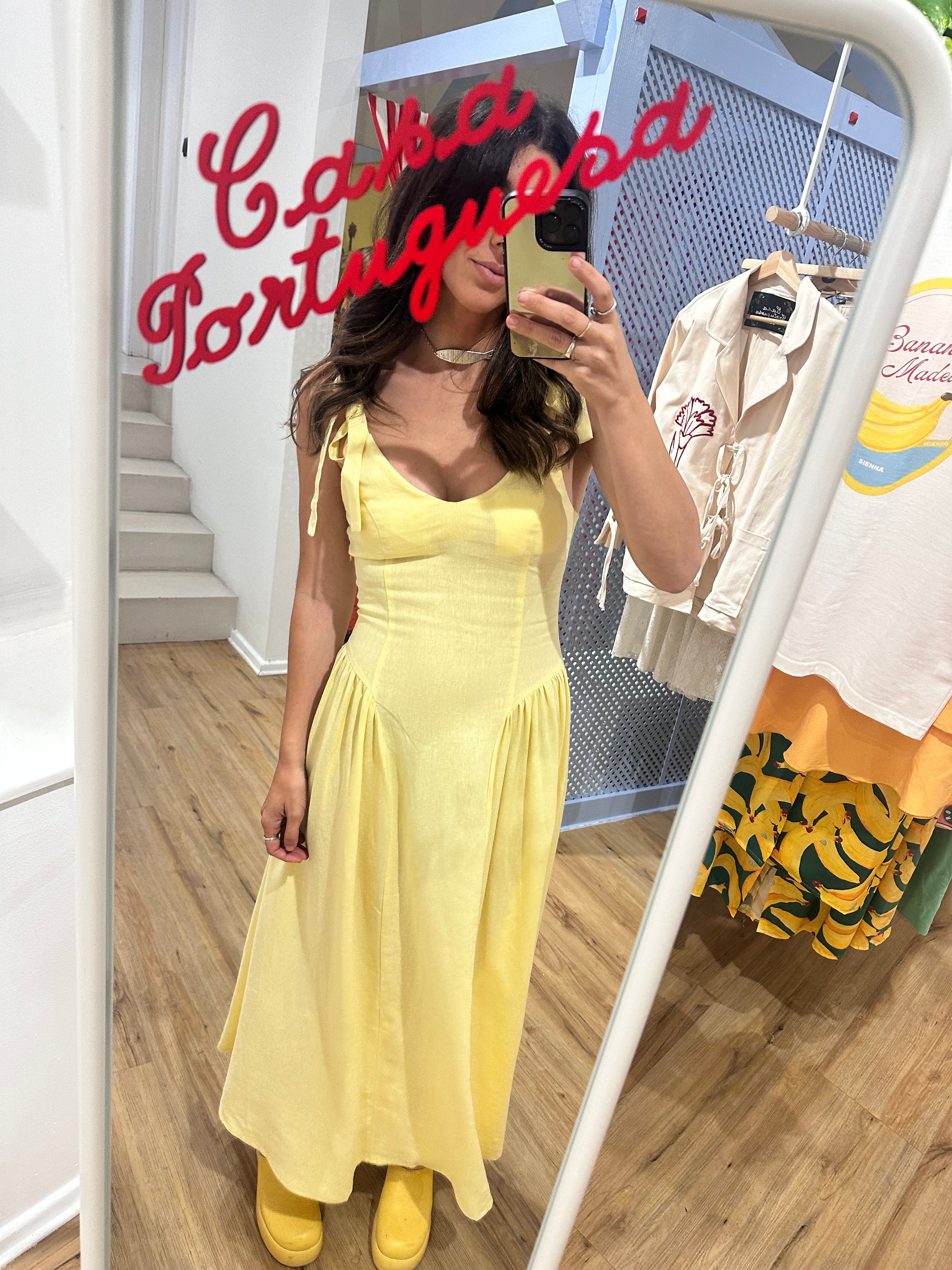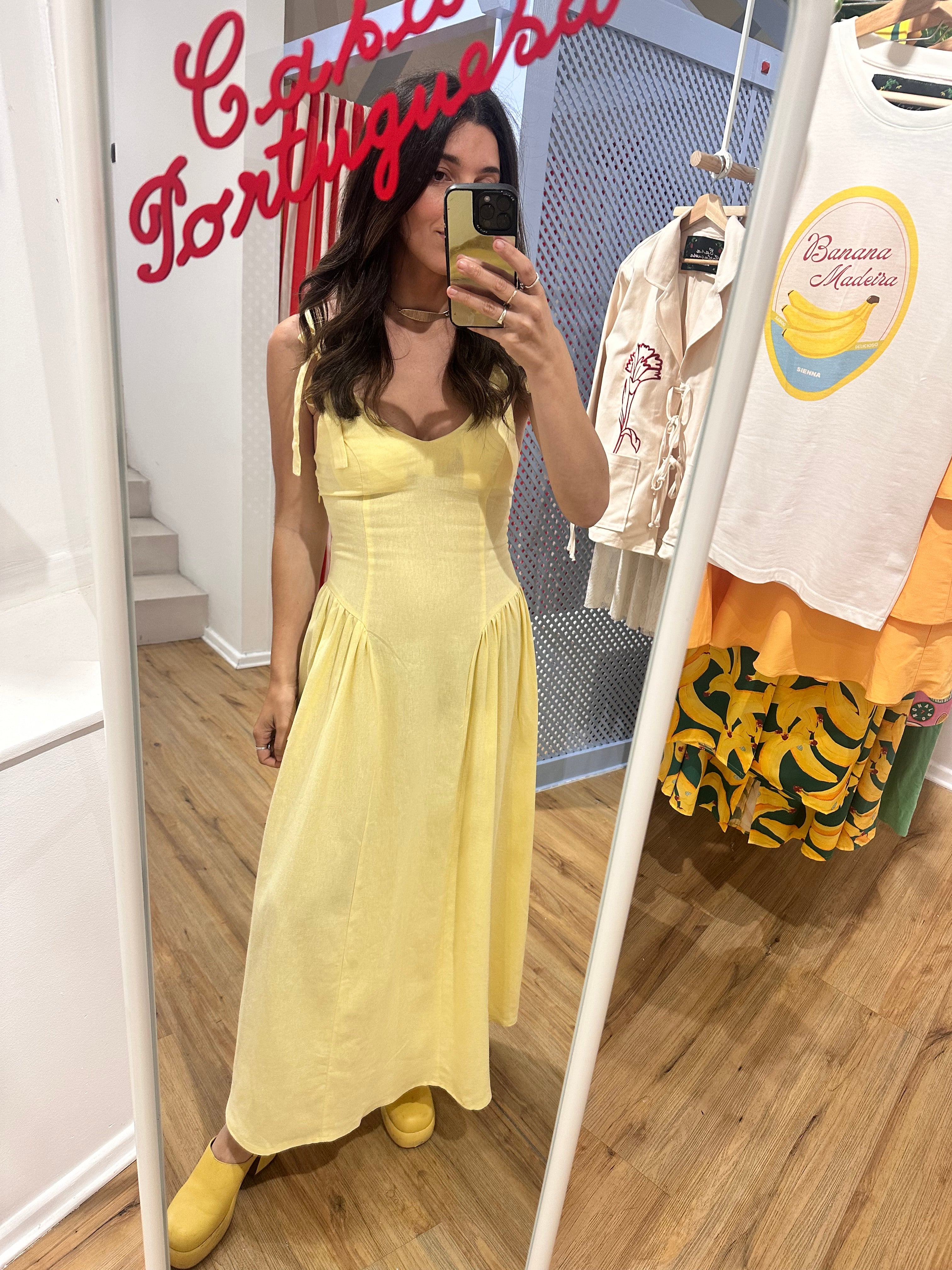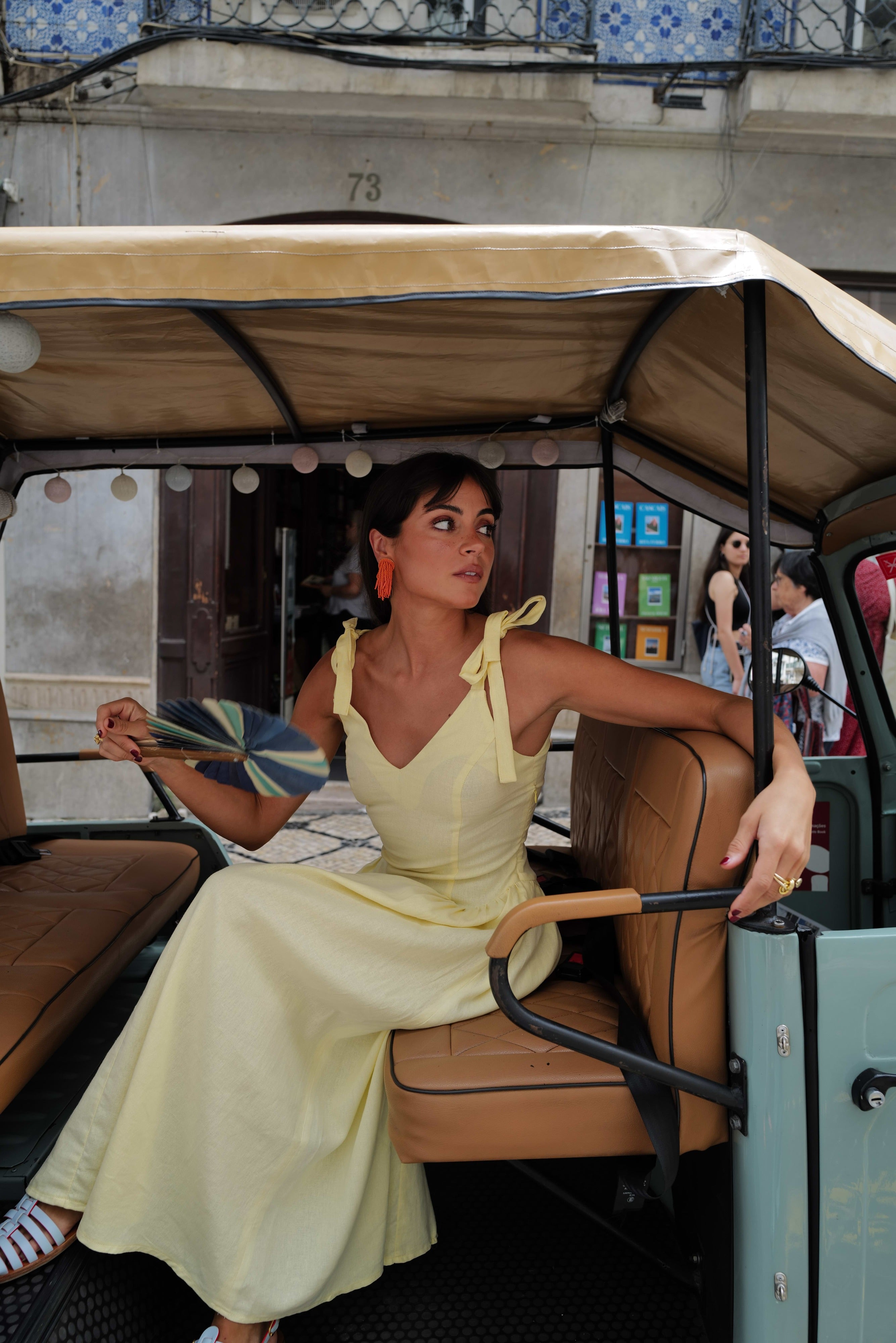 O vestido DONNA tem uma silhueta de corte princesa com alças de amarrar e um decote em "V".
