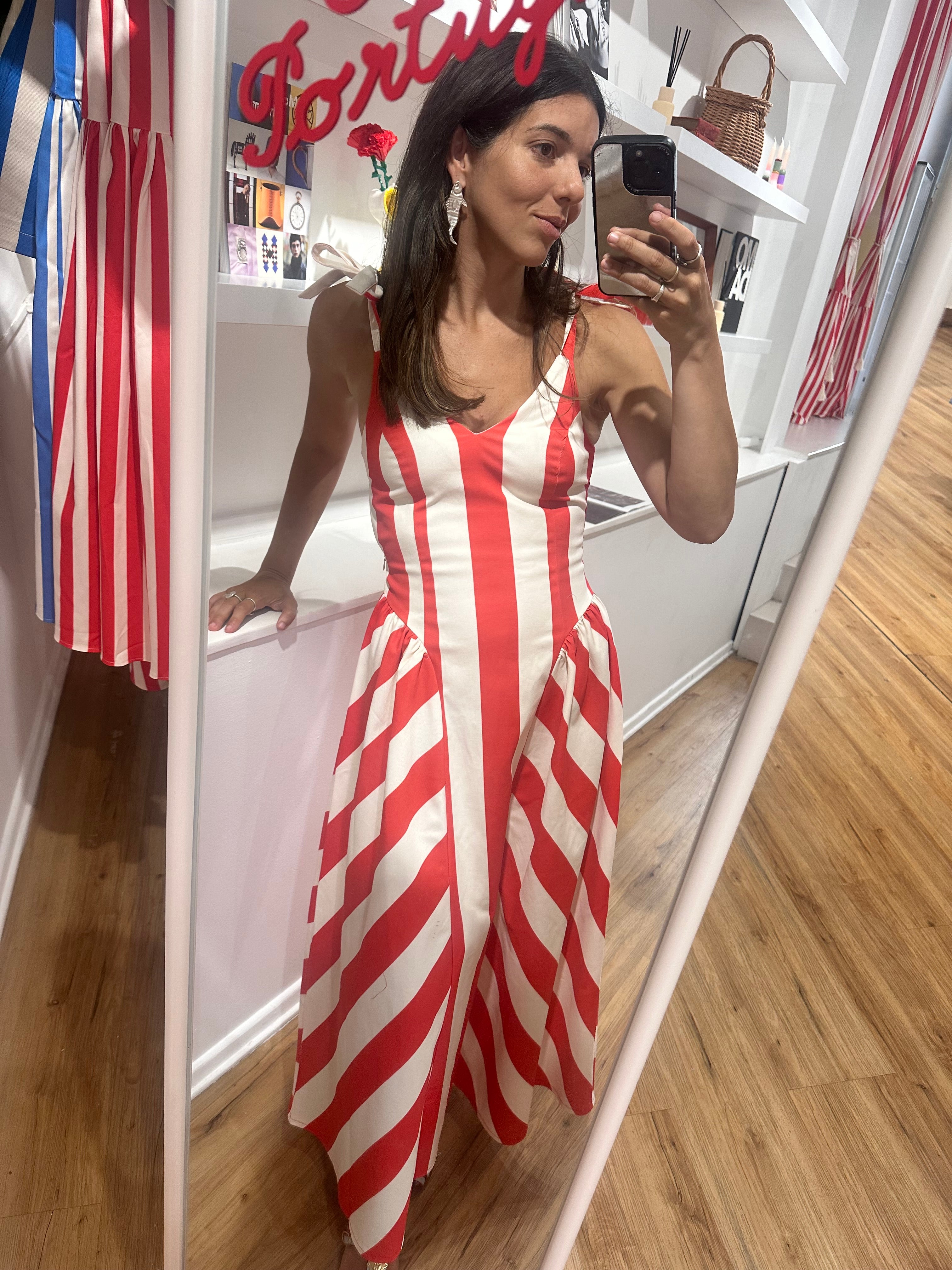 O vestido DONNA tem uma silhueta de corte princesa com alças de amarrar e um decote em "V".