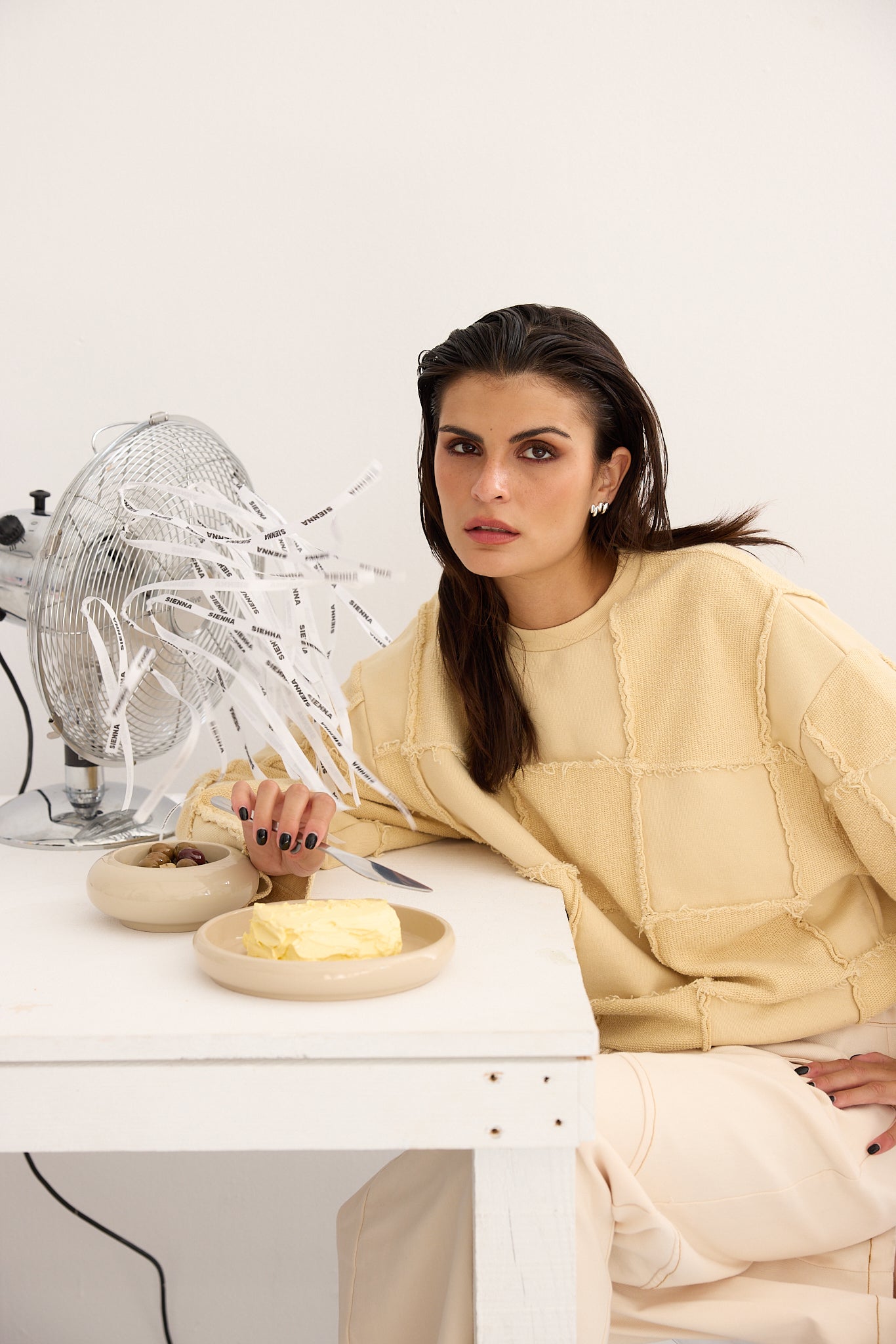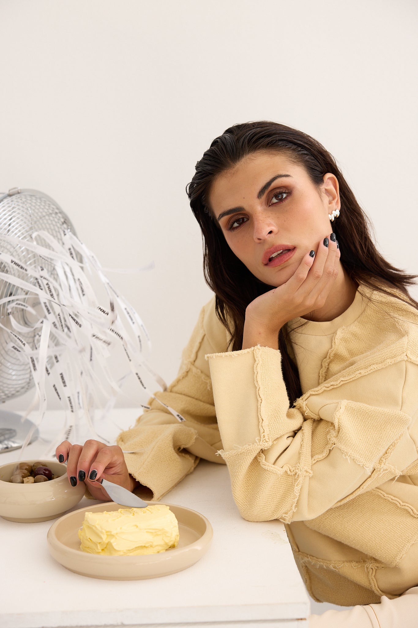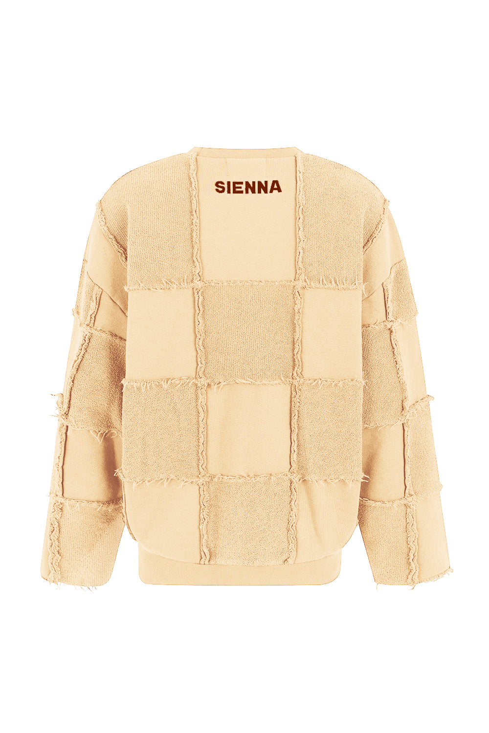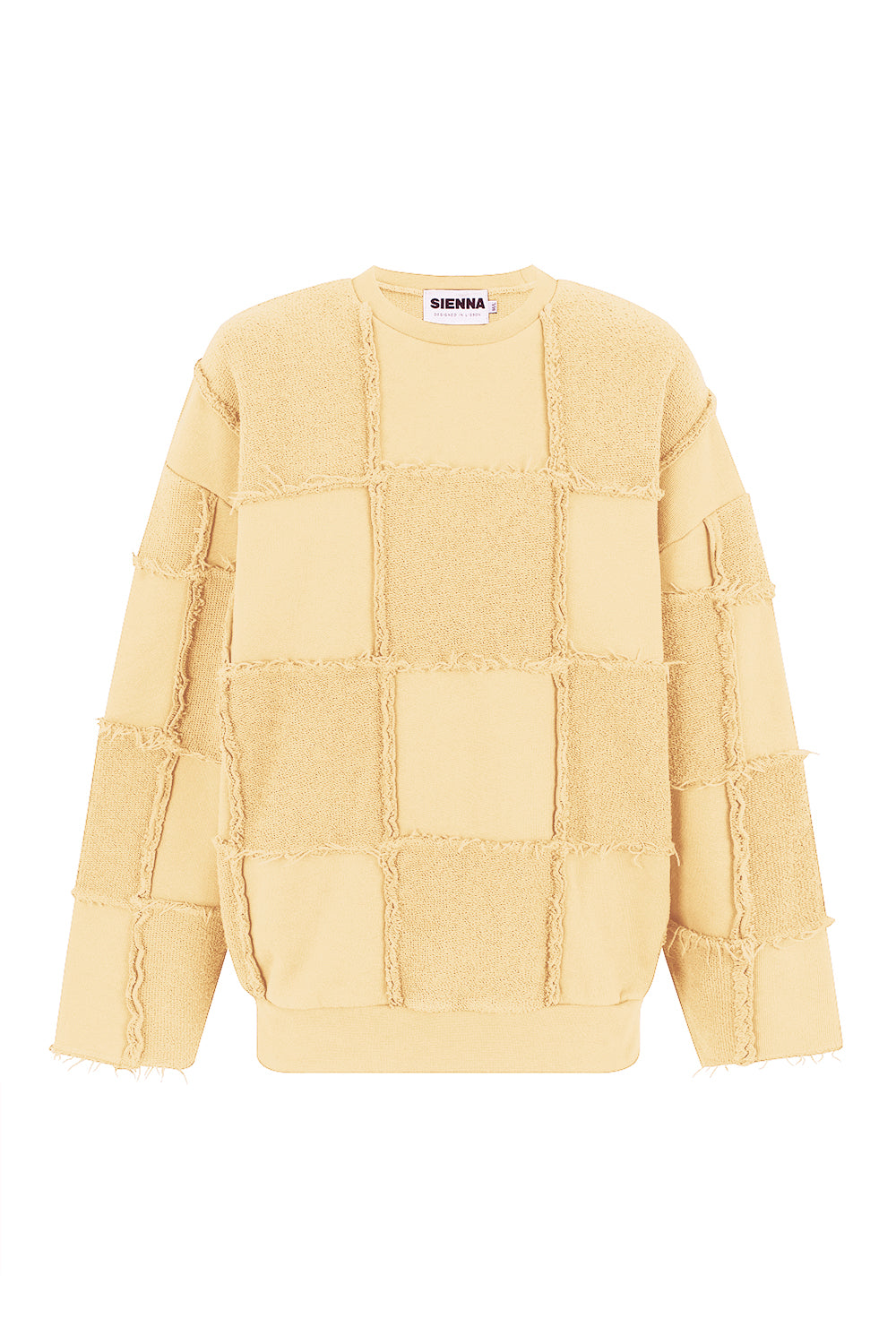 Our FRANCES sweater is one of our favourite pieces of the season. This piece is special in so many ways. Not only is it our first sweater with our logo embroidered on the back, but it's also made of patchwork, all sewn one by one to create this unique square pattern.