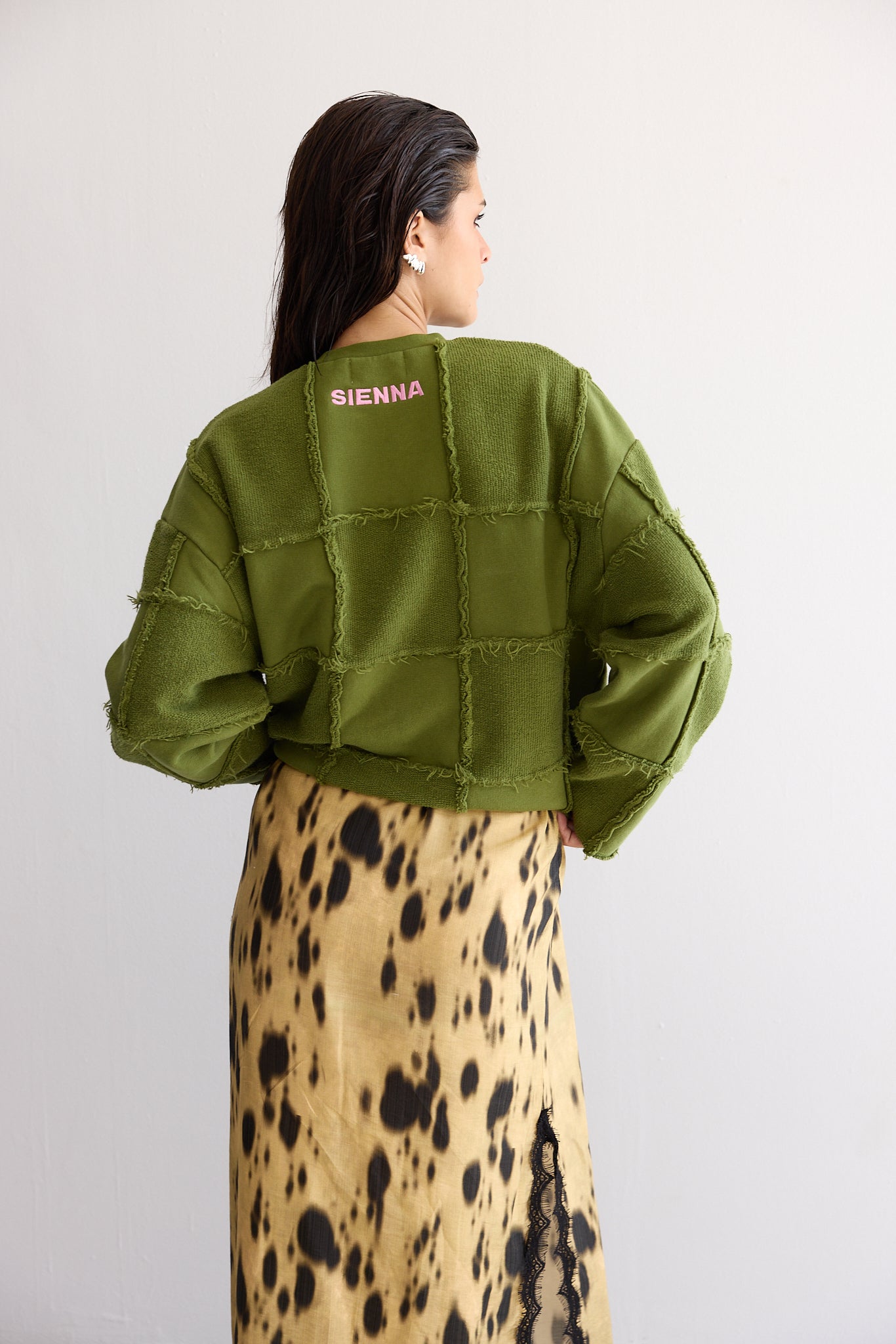 Our FRANCES sweater is one of our favourite pieces of the season. This piece is special in so many ways. Not only is it our first sweater with our logo embroidered on the back, but it's also made of patchwork, all sewn one by one to create this unique square pattern.