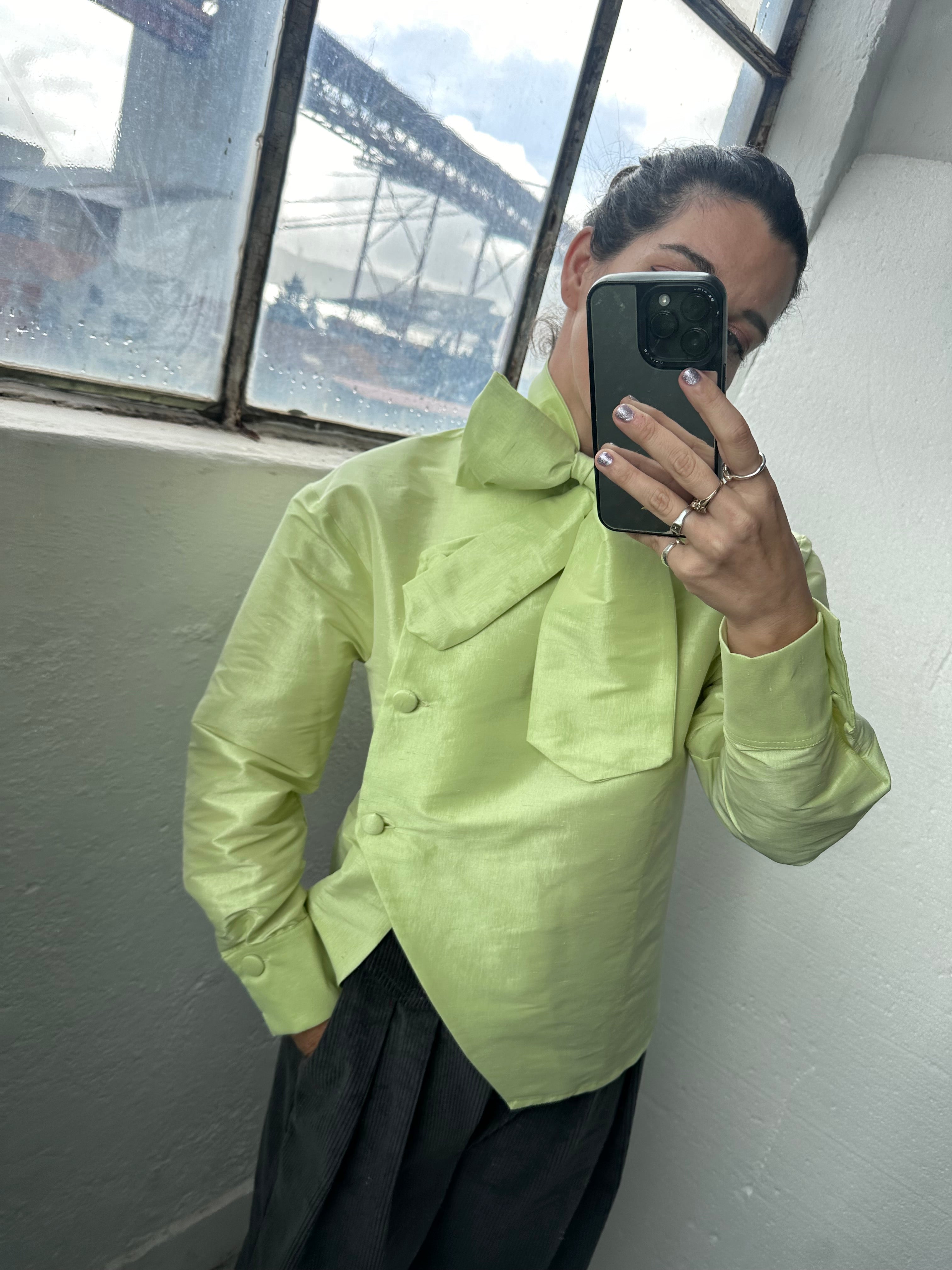 Com carcela assimétrica e botões, bem como gola e punhos contrastantes. Vem ainda como um lenço que pode tornar-se em laço, cinto ou gravata, adaptando-se a cada momento.