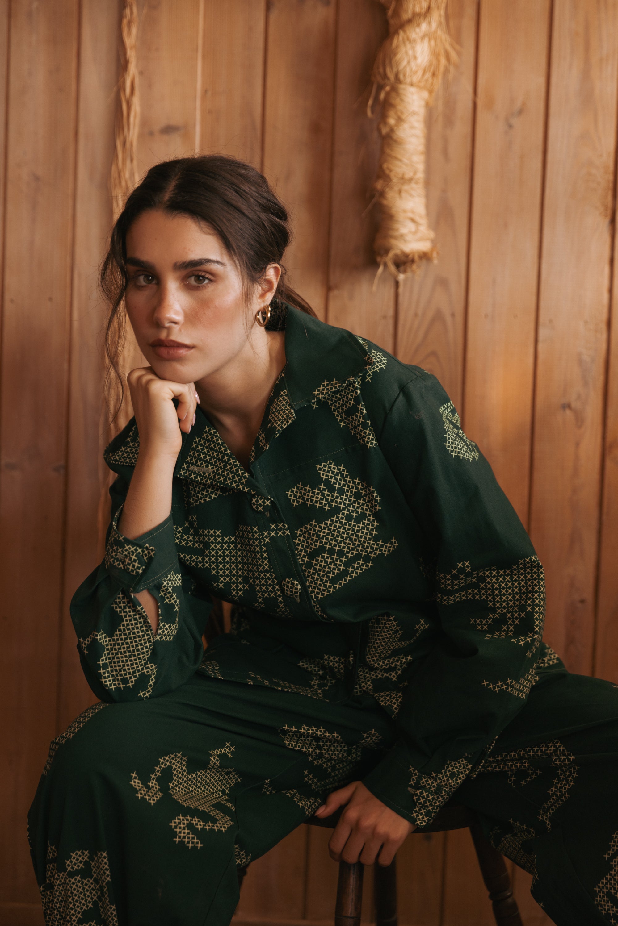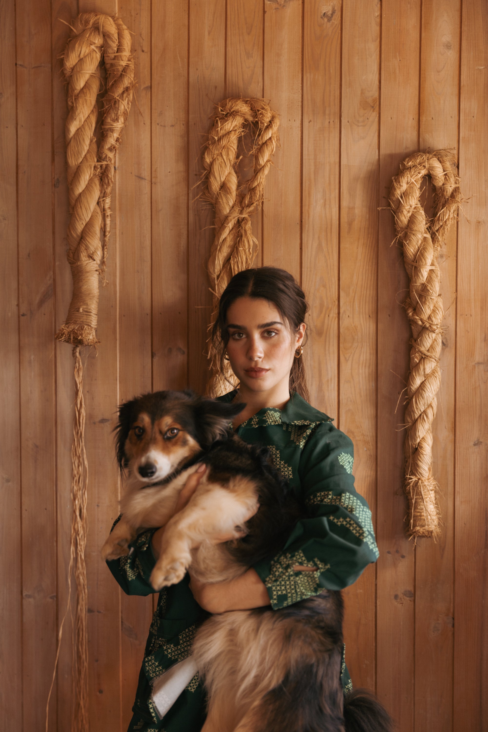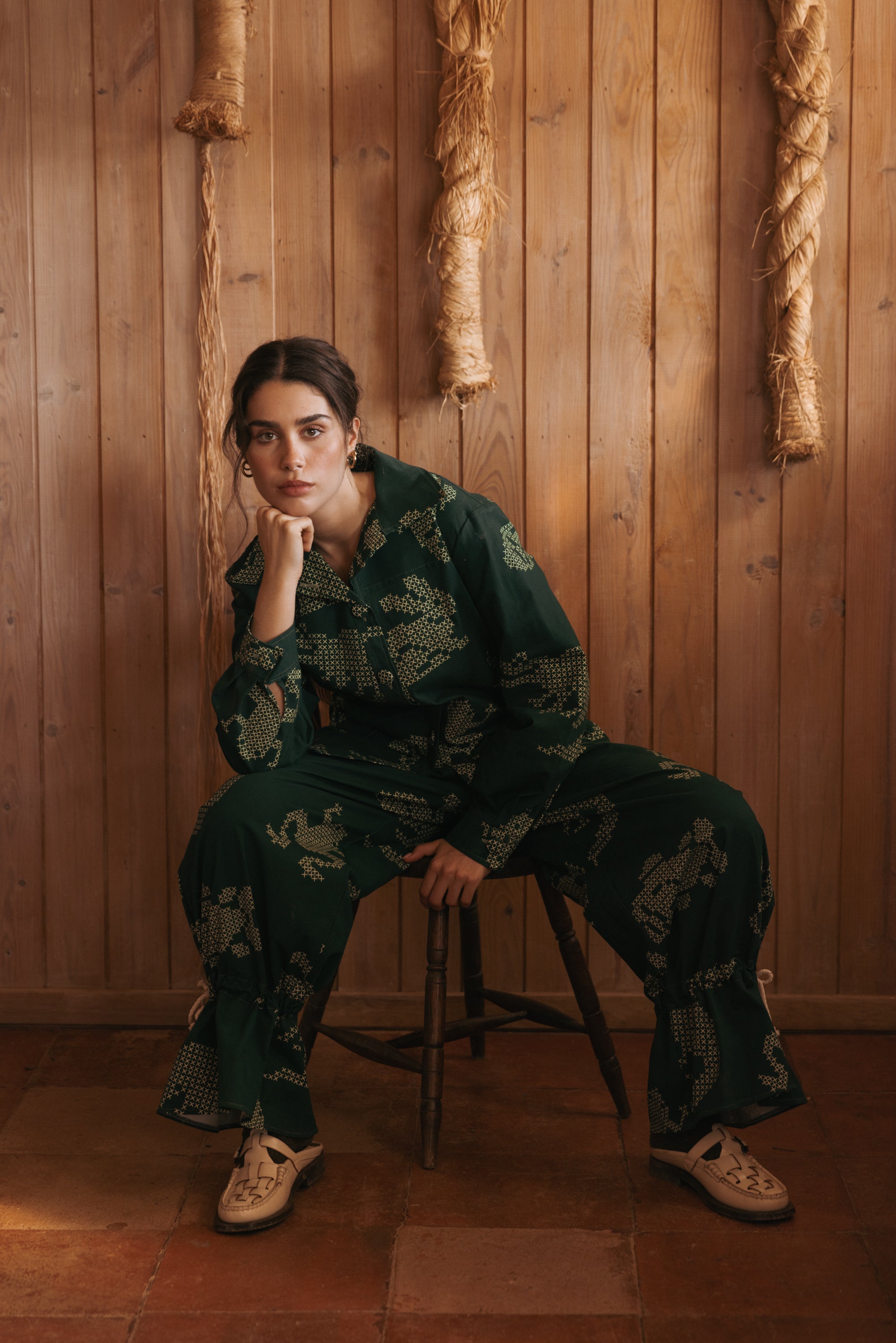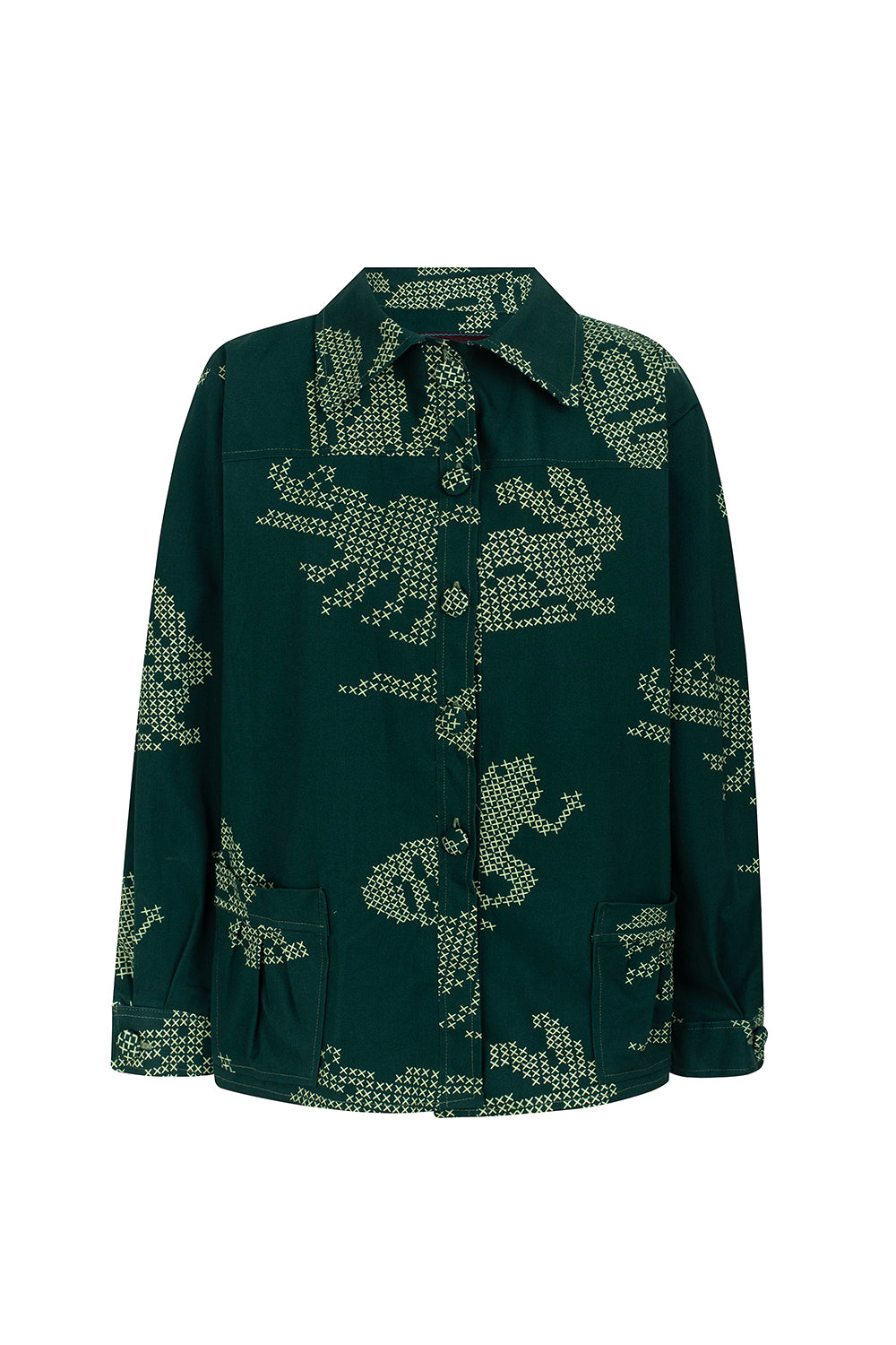The LAIKA shirt is a piece that perfectly expresses the essence of the BY THE LAKE collection: oversized, with a bold and fun pattern. With a shirt collar, this long-sleeved overshirt is perfect to wear with the trousers of the set.