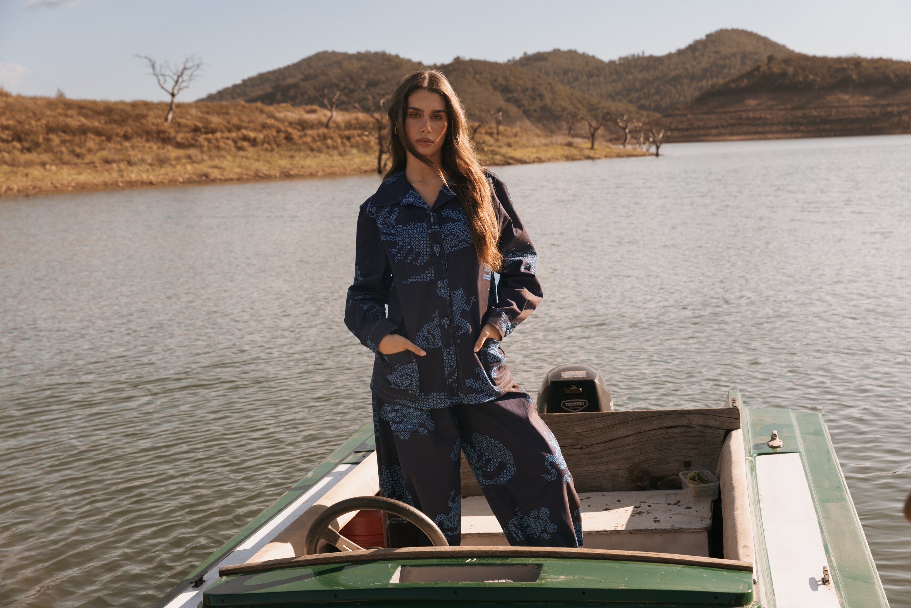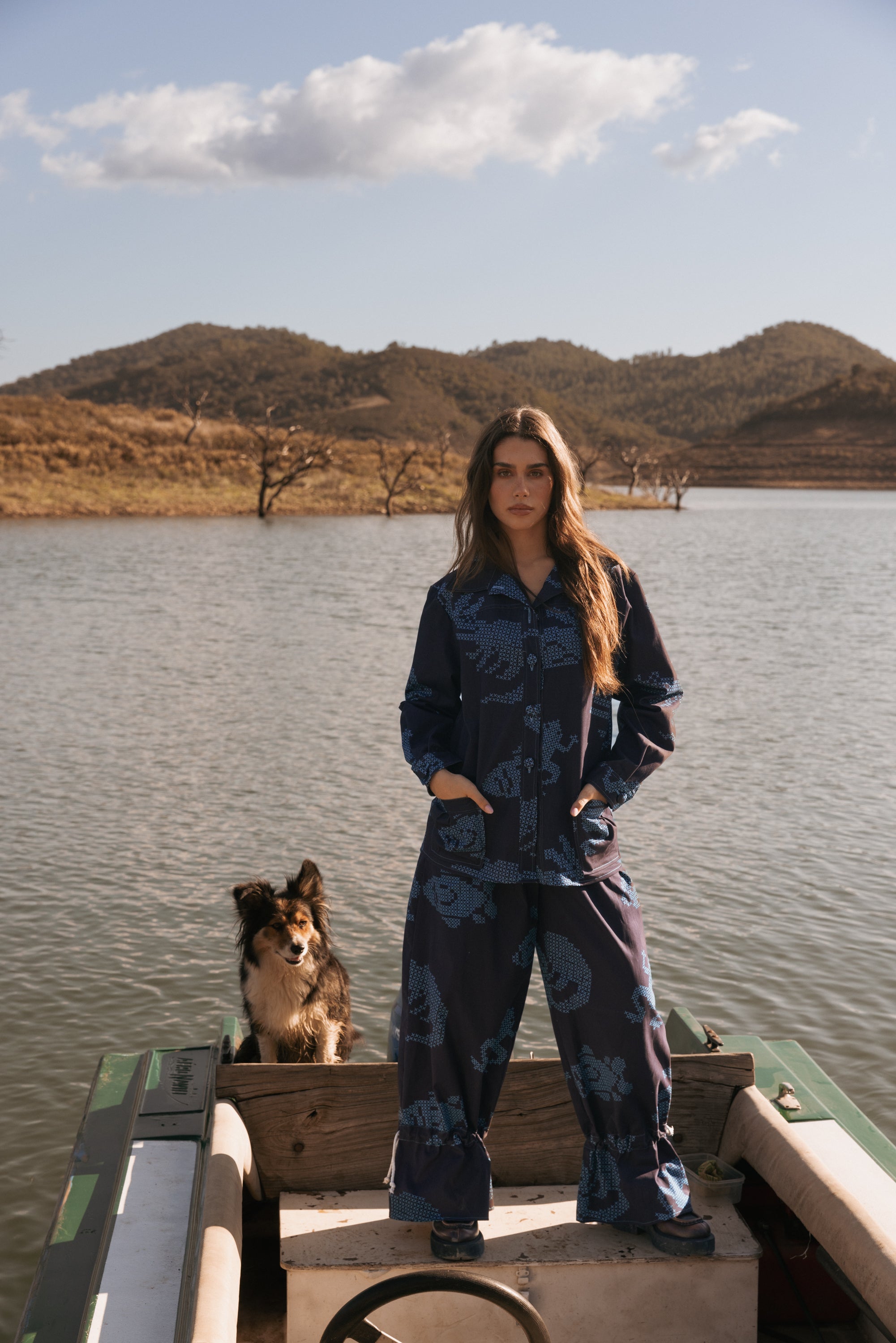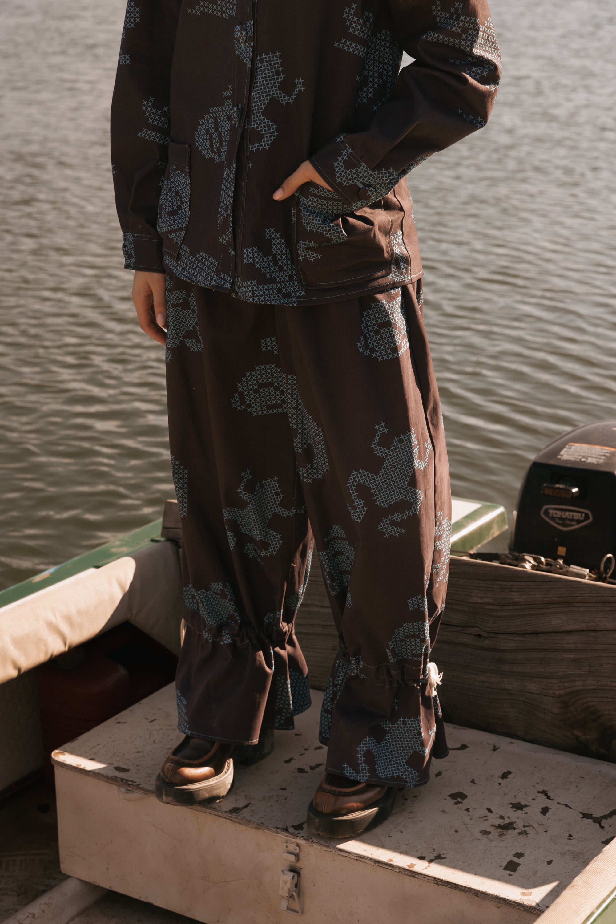 O padrão destas calças é também muito especial. É composto por vários animais que habitam nos lagos e charcos - como sapos, jacarés, coelhos e peixes - desenhados com cruzes, imitando o bordado ponto-cruz.