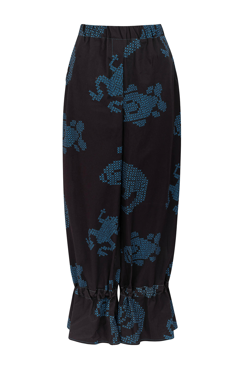 The pattern of these pants is also very special. It is composed of various animals that inhabit lakes and ponds - such as frogs, alligators, rabbits and fish - drawn with crosses, imitating cross-stitch embroidery.