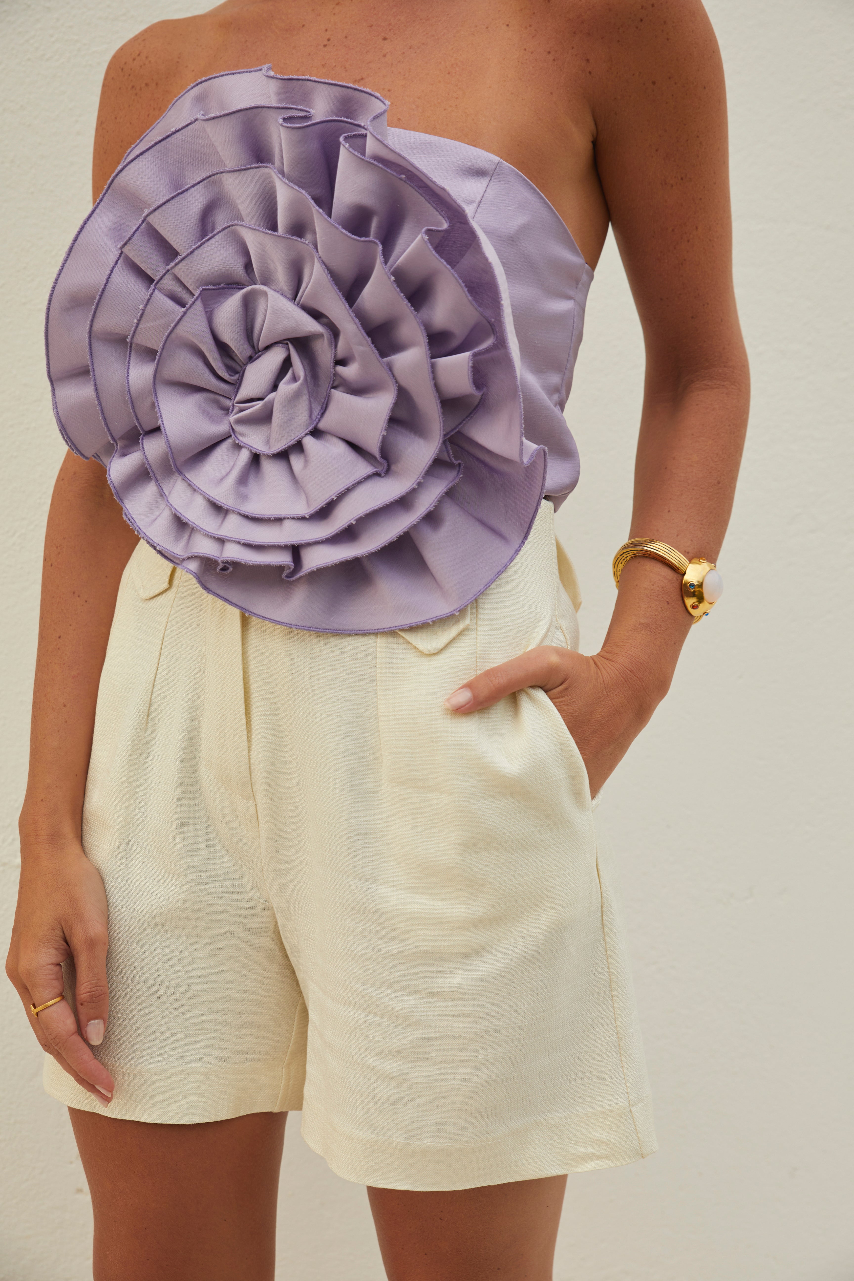 We've been dreaming to make a flower top since ever. Finally we've find a way to do our LOTUS Top. A strapless bandeau top with sculptural pleated rose detail. Match yours with our Bea Trousers for the perfect look.