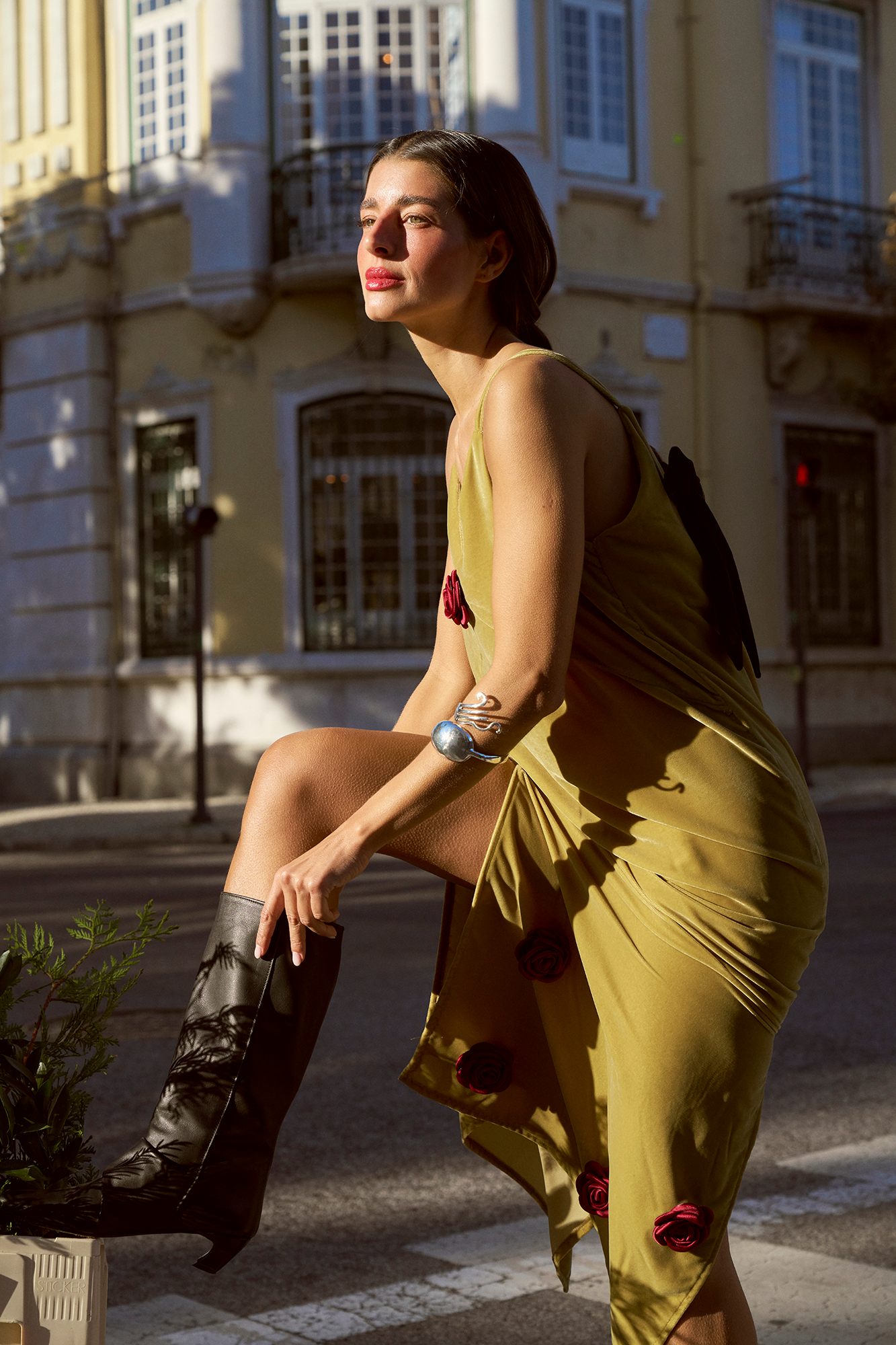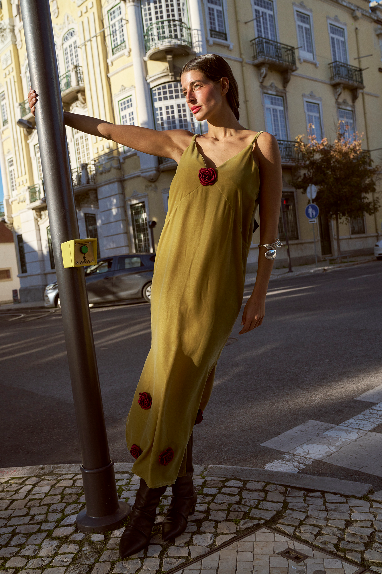 Estamos loucas com o vestido MAD. Uma peça diferenciada, feminina e fluída, este vestido é perfeito para as celebrações deste fim de ano. Com aplicações de rosas encarnadas e cortado em veludo suave verde musgo, esta peça não deixará ninguém indiferente.