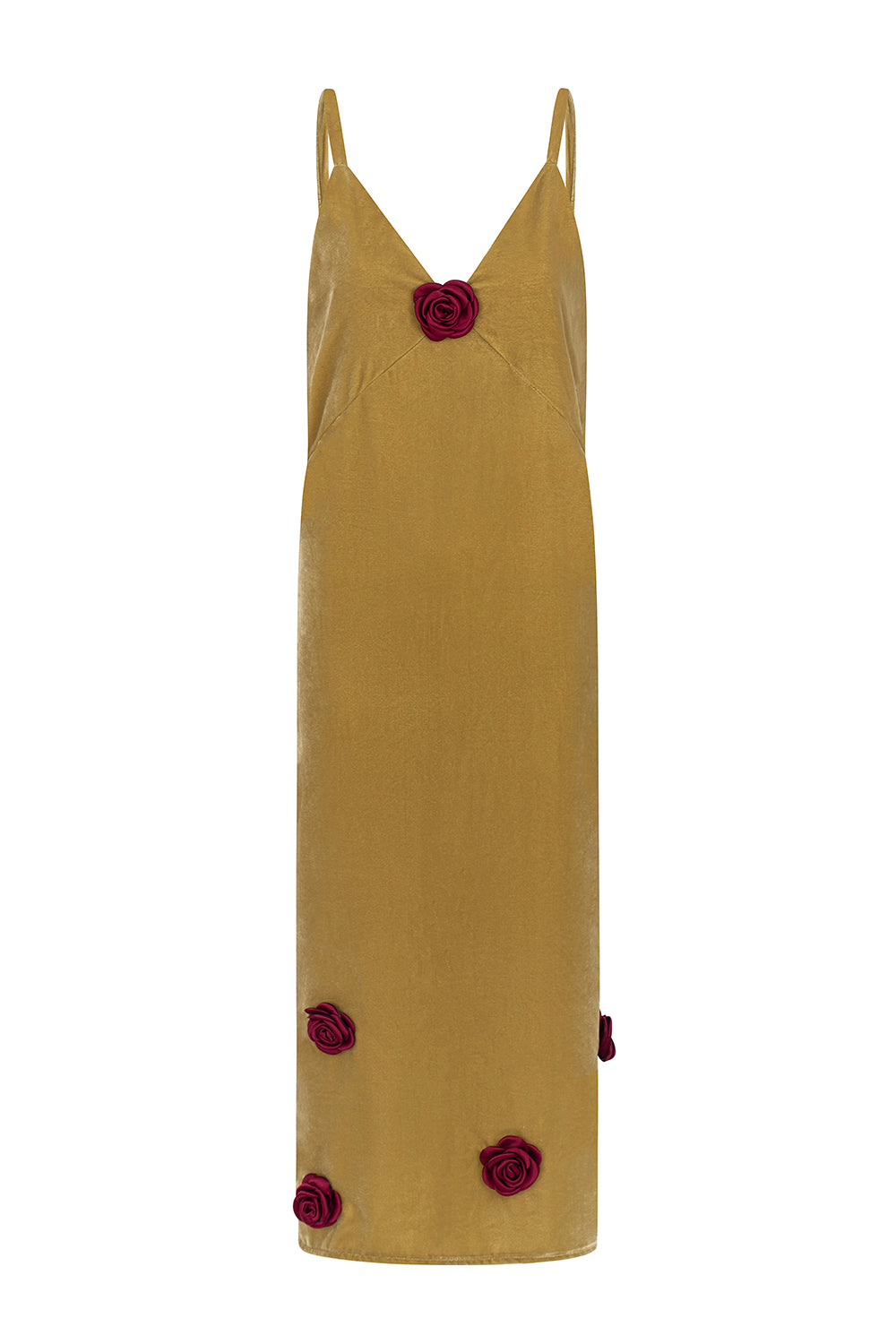 We're crazy about the MAD dress. A unique, feminine, and flowing piece, this dress is perfect for end-of-year celebrations. With crimson rose appliqués and cut from soft moss green velvet, this piece will leave no one indifferent.