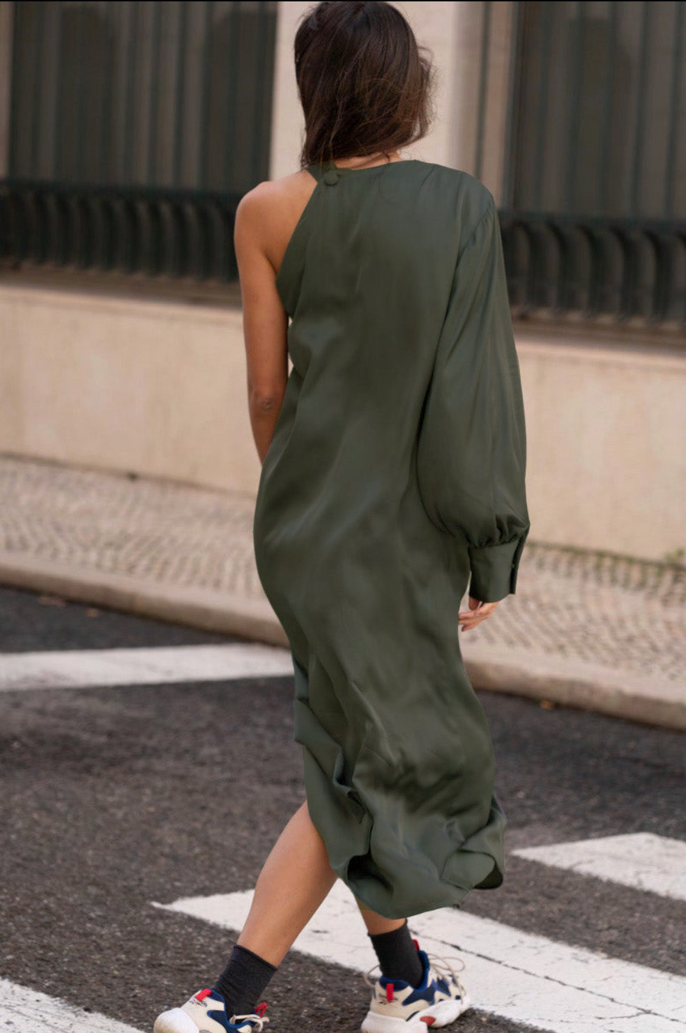 Our Marie dress is definitely one of our best sellers. Inspired in our original Marie blouse, is an elegant choice for any event. With a straight fit, assimetrical sleeve and a slit on the side of the tigh, it's the perfect ally to feel sexy and confortable at the same time. Match yours with sneakers or heels, anyway you won't look unnoticed.