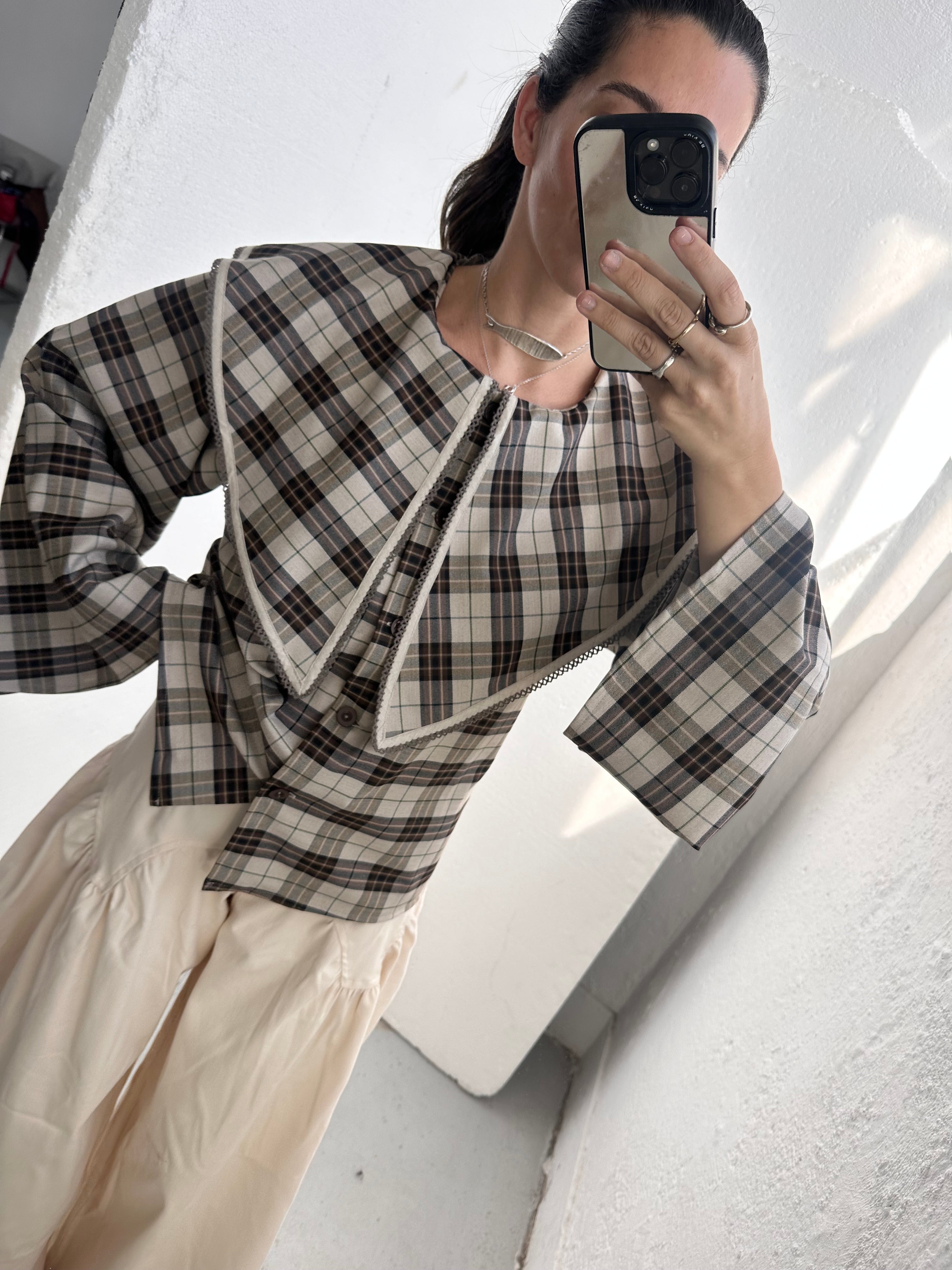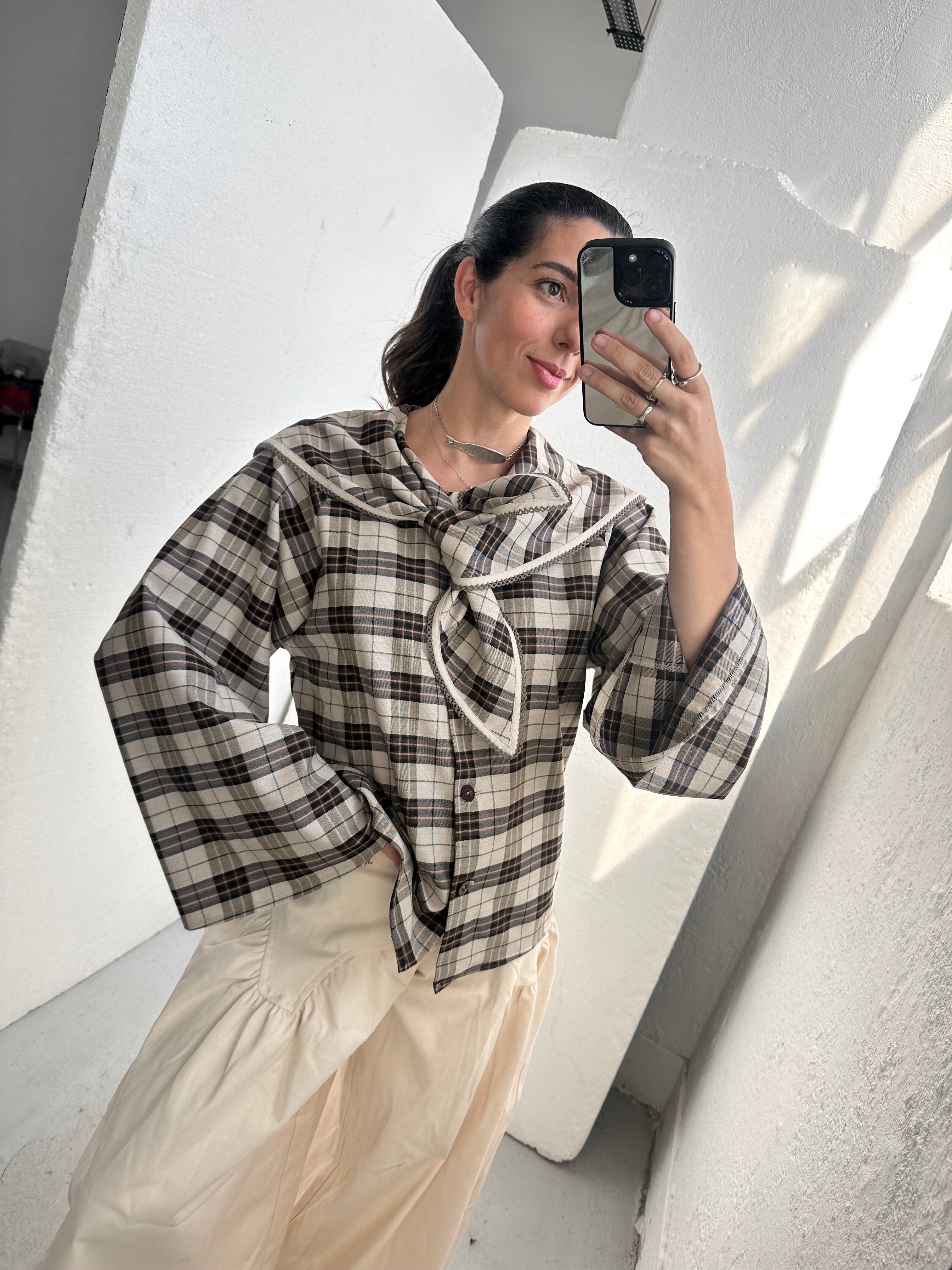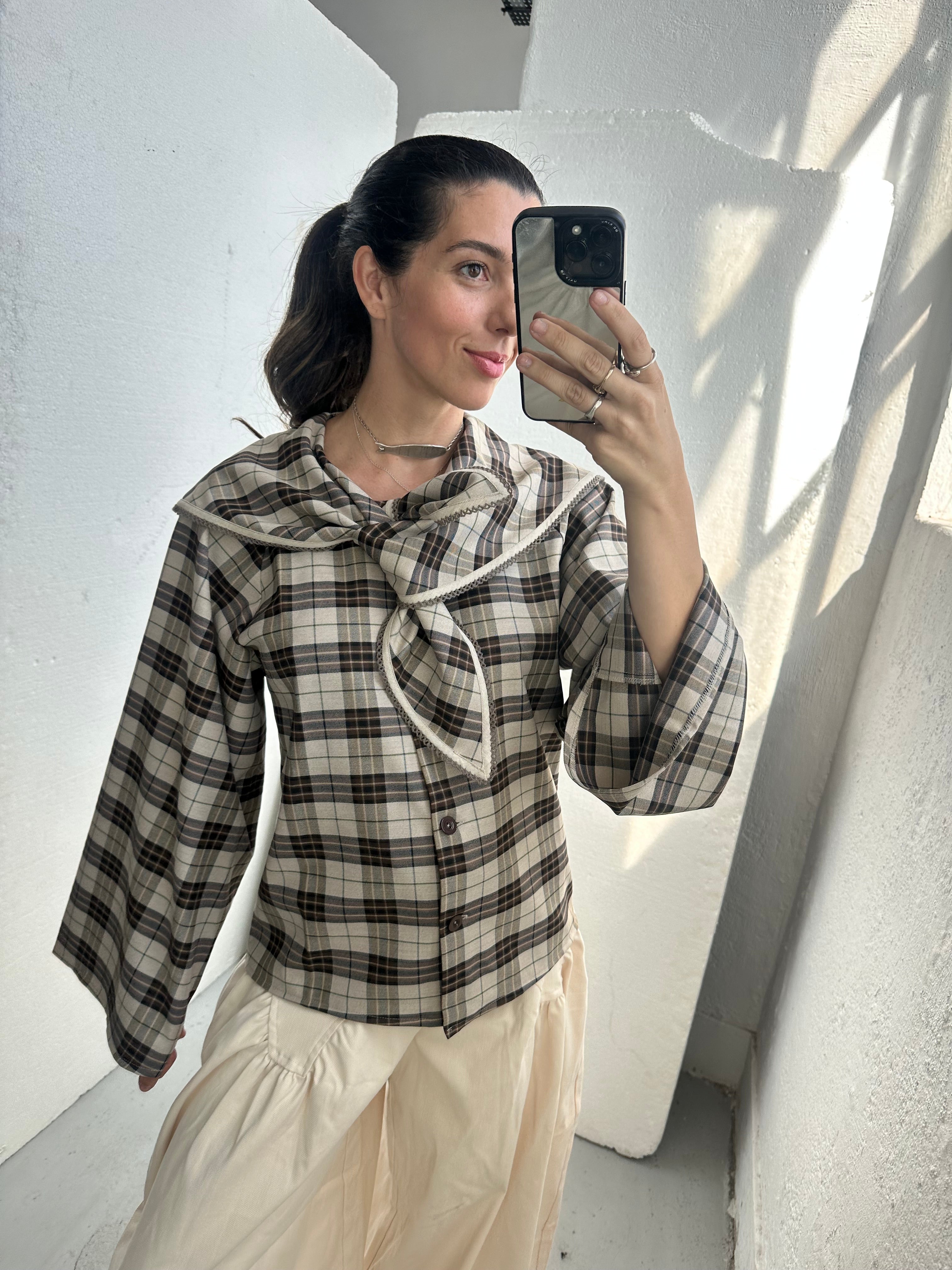 ODETE is an oversized shirt with bell sleeves and a collar inspired by the scarves worn by country women.