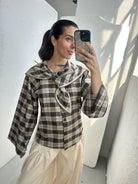 A ODETE é uma camisa de corte oversized, com mangas sino e colarinho inspirado nos lenços usados pelas mulheres do campo.