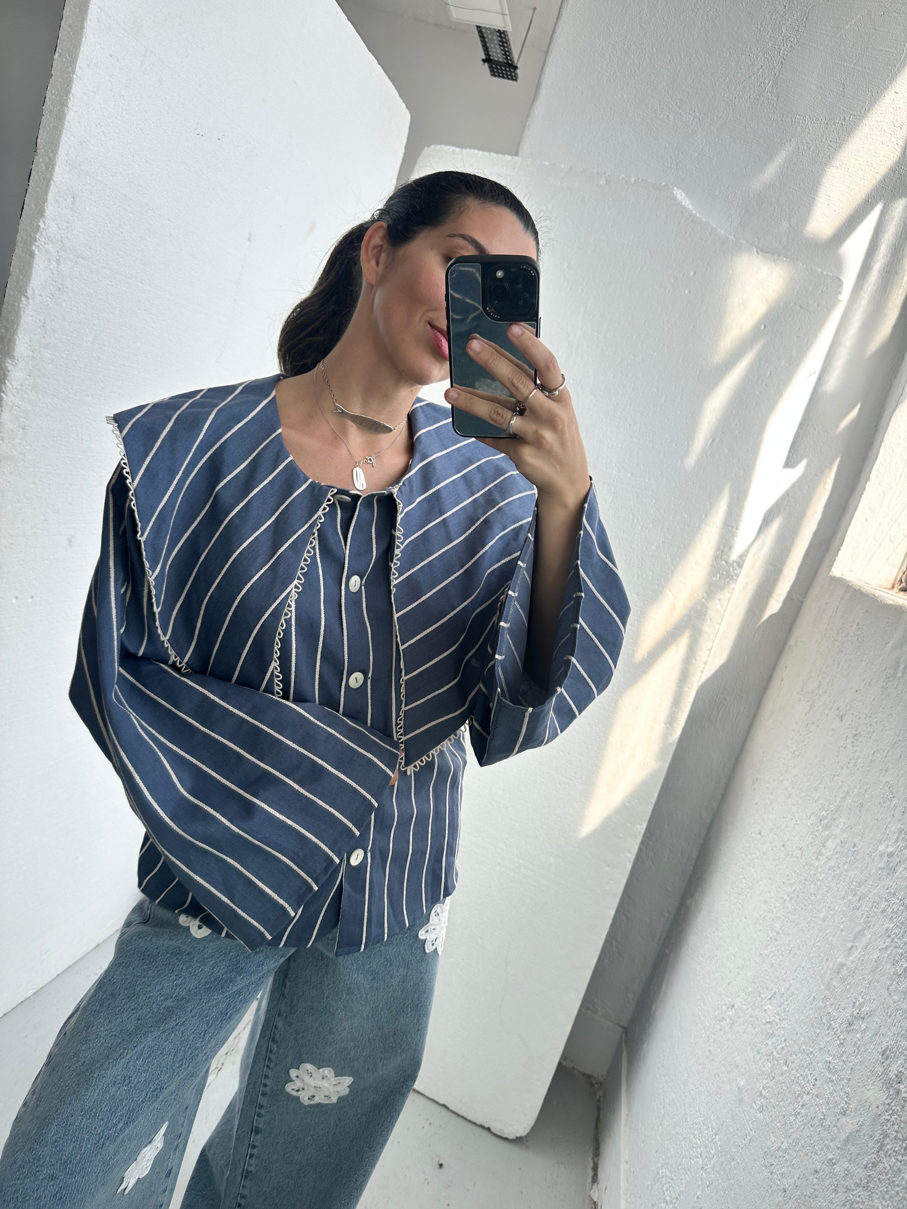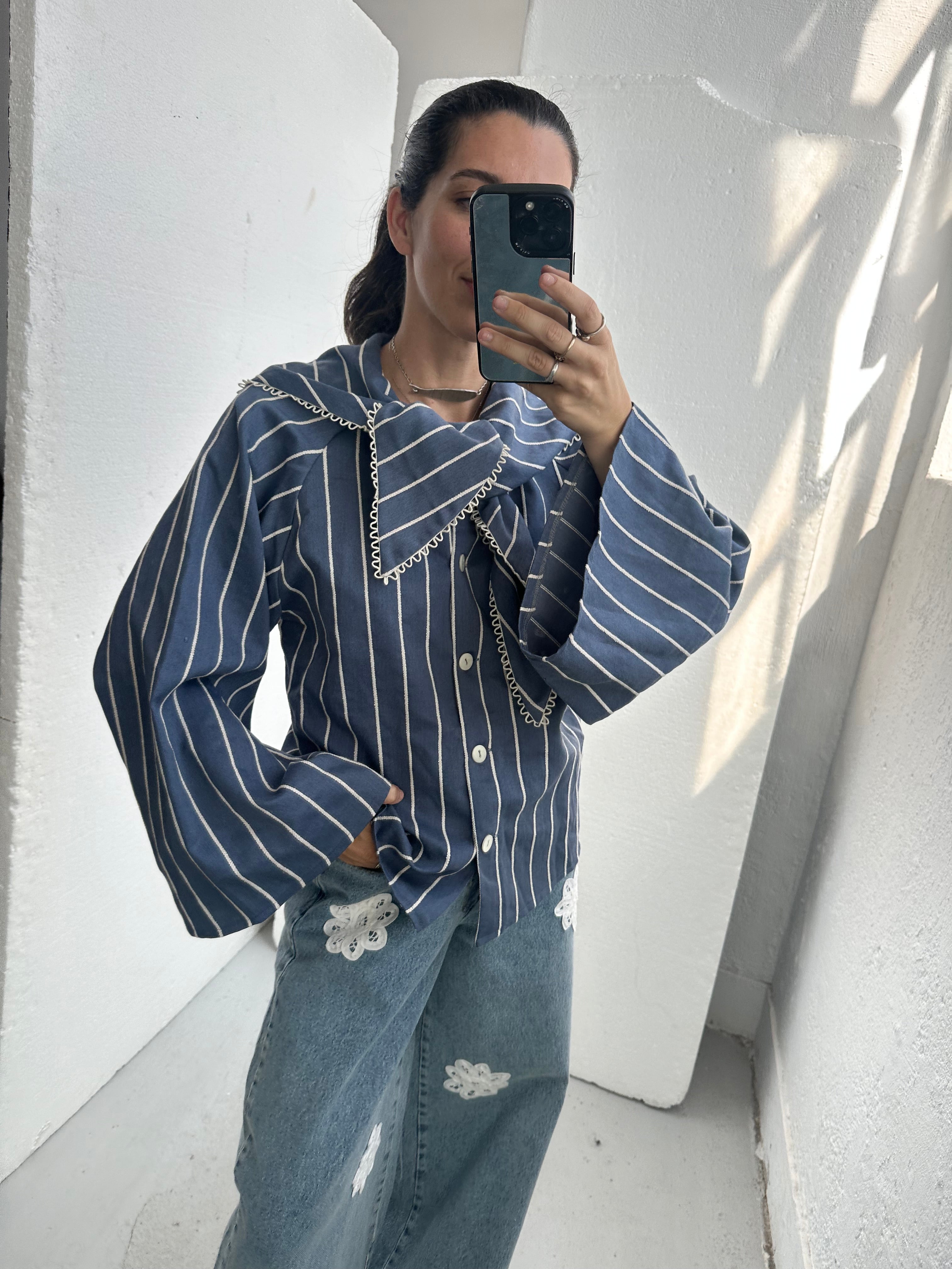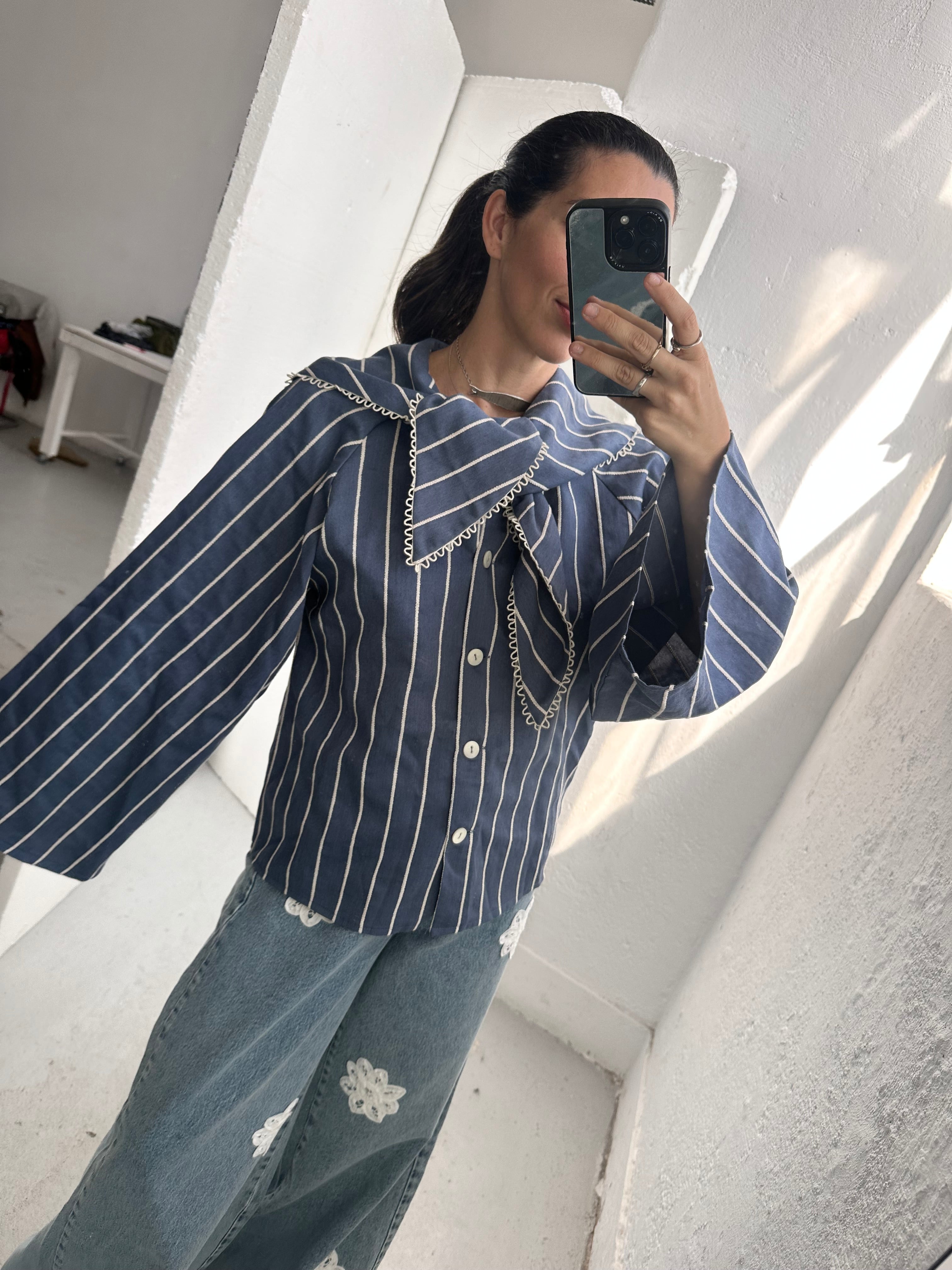 ODETE is an oversized shirt with bell sleeves and a collar inspired by the scarves worn by country women.